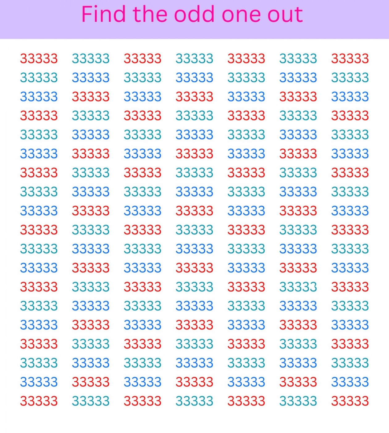 Optičke iluzije su sjajan način da se zabavite, ali i da testirate svoje sposobnosti. Ovoga puta na ispitu će se naći vaš vid i sposobnost koncentracije. A sve što treba da uradite je da u moru brojeva 33333 pronađete onaj koji se razlikuje od ostalih.