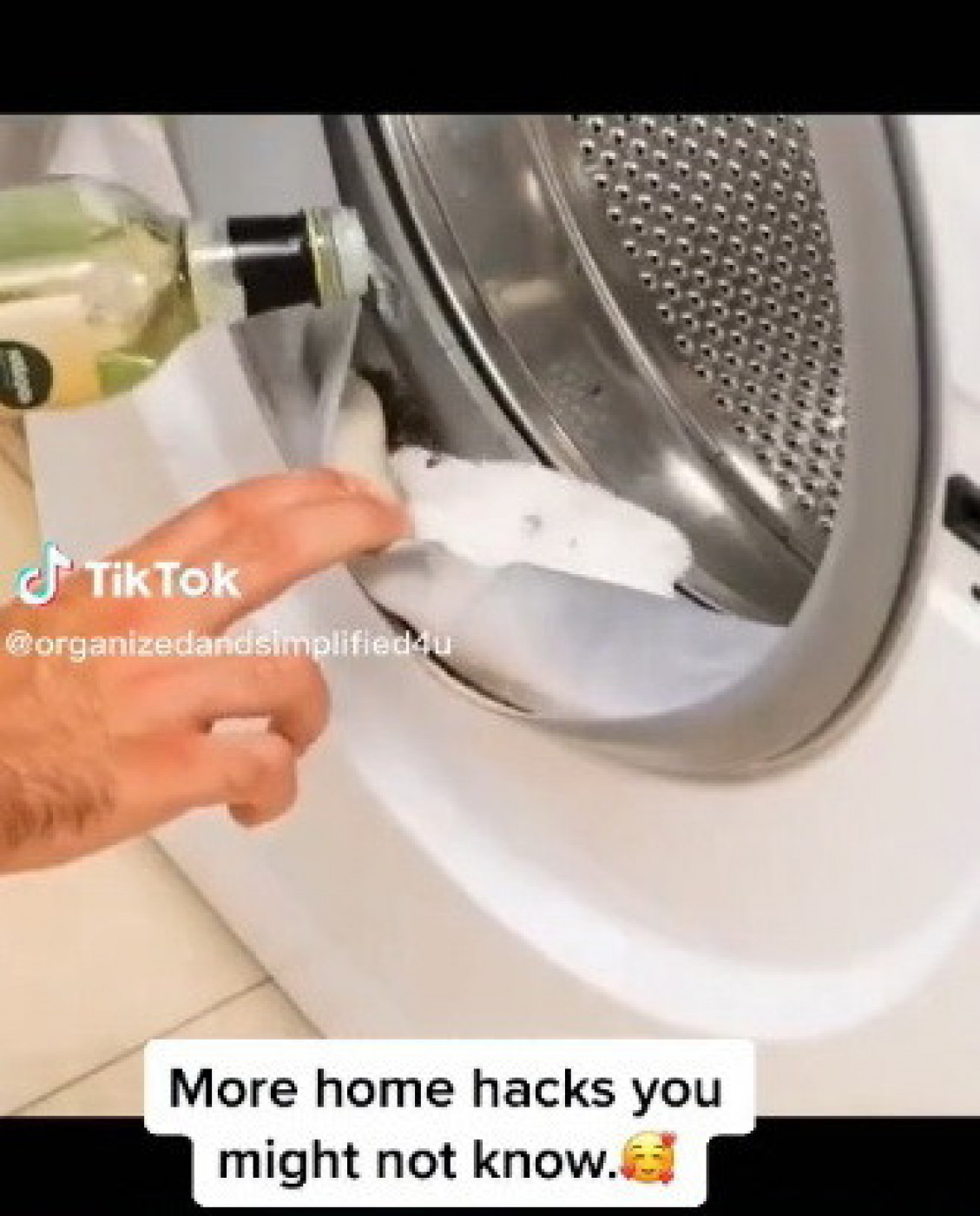 U snimku koji se pojavio na TikToku korisnica Džen Vatson tvrdi kako je dovoljno unutar gume veš mašine sipati malo praška za pecivo i malo sirćeta, a zatim uključiti aparat kako bi isprala svu nečistoću.