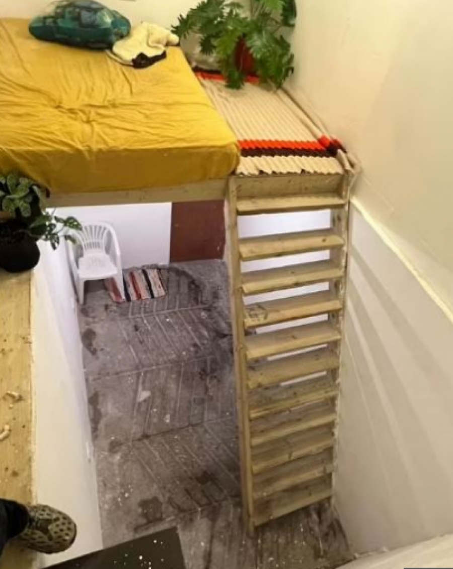 Vrhunac cele priče je da se usred prostorije nalaze drvene merdevine koje vode do kreveta koji je "na sprat", a najjeziviji momenat nije ni stari sunđer bačen po podu koji predstavlja alternativni krevet, već što je sa jedne starne kreveta zid, a sa druge je "ambis". Osoba koja bi legla u tu vrstu improvizovane prostirke bi doživotni invaliditet, budući da se sa druge starne kreveta pada dirketno u prizemnlje. Od ostatka nameštaja tu je bela stara plastična dvorišna stolica i neka vrsta minijaturne podne prostirke.