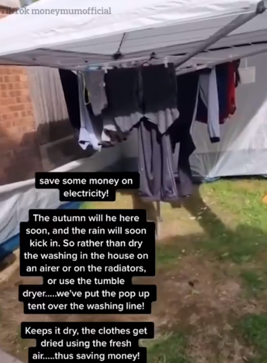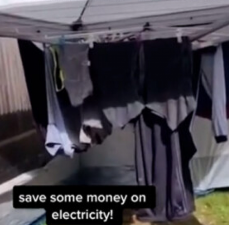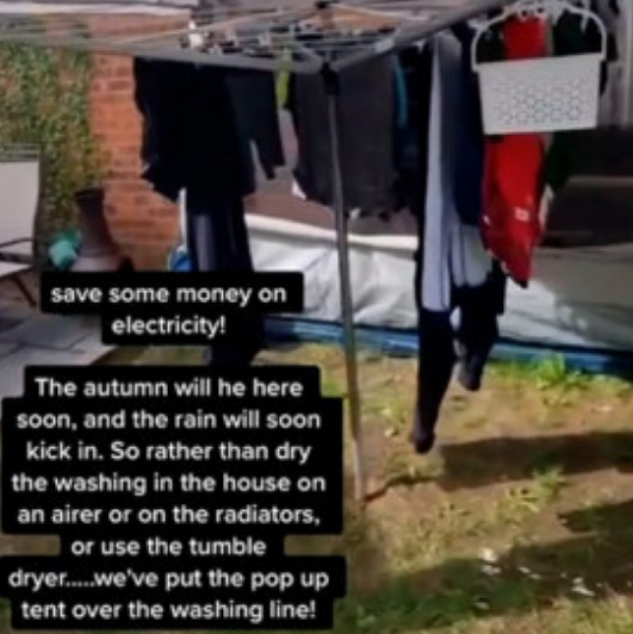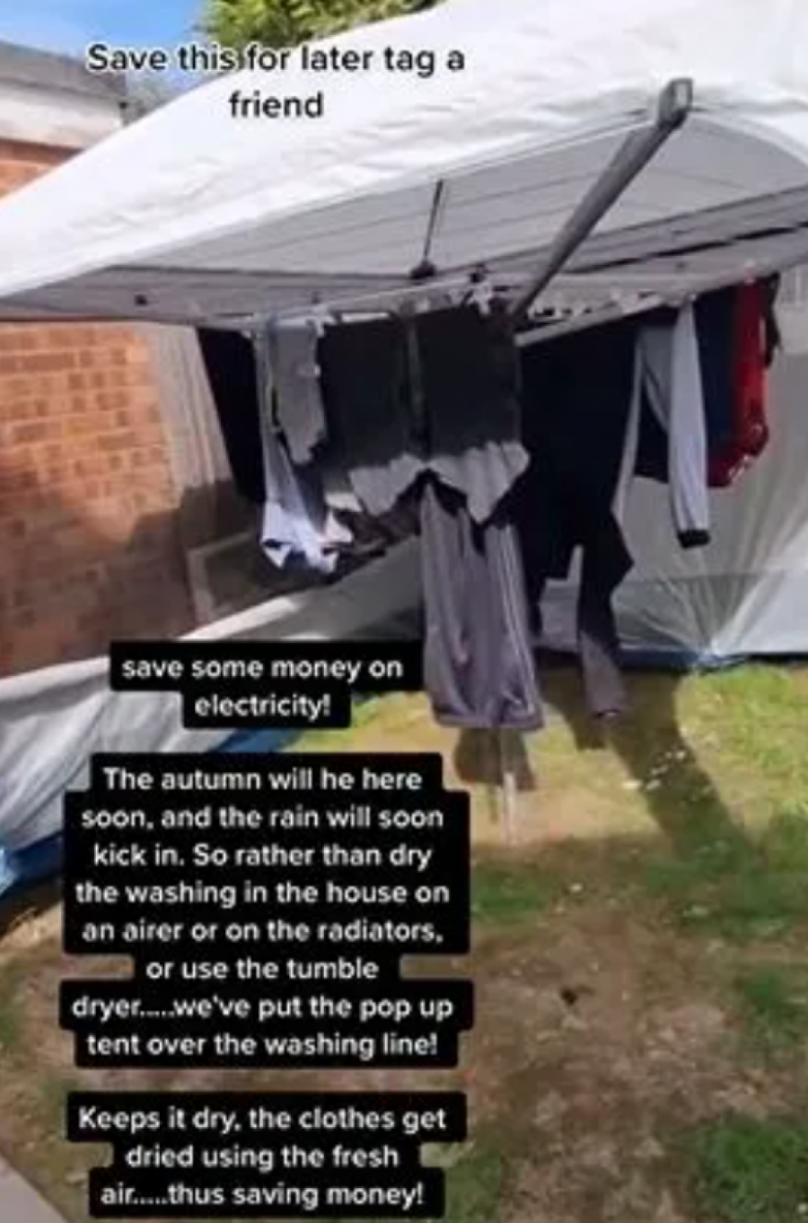 Naime, ona je rešila da suncobran-tendu koju koristi tokom toplih letnjih dana za zaštitu od sunca sada iskoristi na drugi način. Ona je ovu imrpovizovanu tendu namontirala preko sušila za veš. Budući da postoji četiri dela koja svako šatorsko krilo vezuju za zemlju, ona je to uspela da veže za delove sušila za veš. Tako je usred dvorišta dobila idealnu sušilicu za veš koja čak ima i nastrešnicu u slučaju kiše.