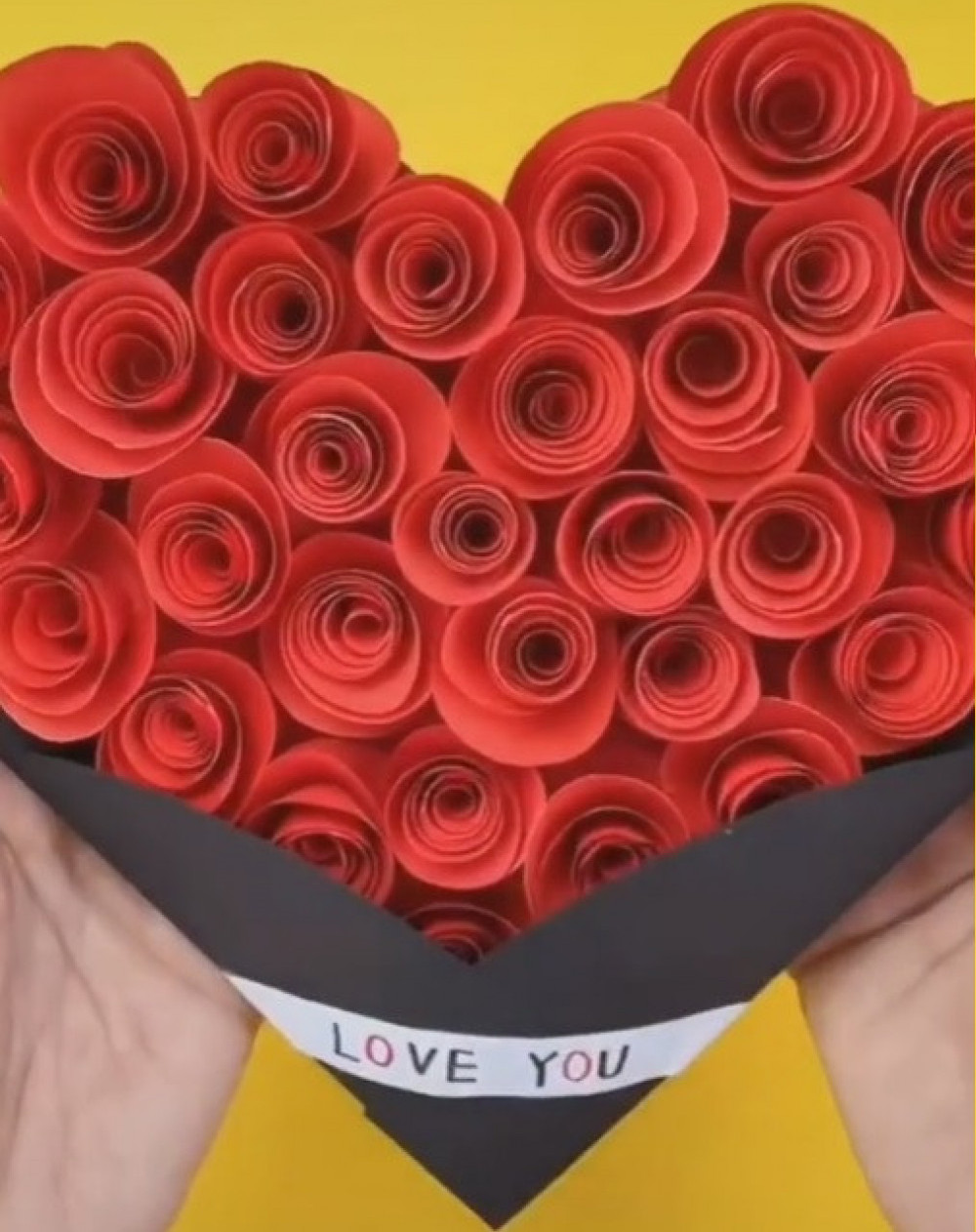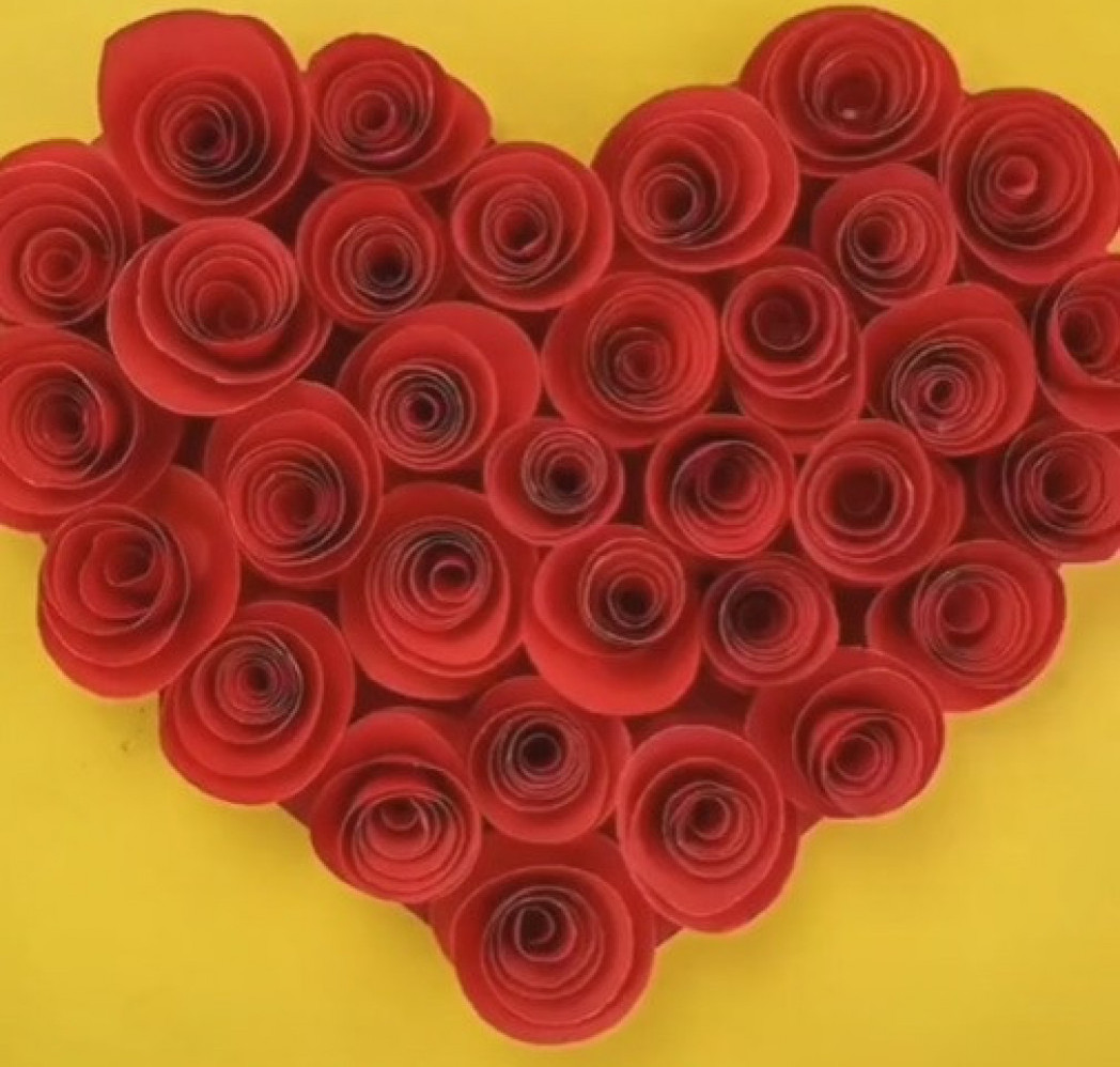 Zatim isecite mnoštvo krugova od crvenog papira, manje ili veće, po želji, broj će zavisiti od veličine krugova i veličine srca. Krugove isecite na spirale pa uzmite čačkalicu i namotajte spiralu oko nje tako da dobijete ružicu, pa kada to uradite zalepite lepkom kraj spirale za cvet da se ne odmotava. Namotajte onoliko ružica koliko vam treba da prekrijete njima celo srce sa prednje strane, pa ih lepkom zalepite na lice srca.