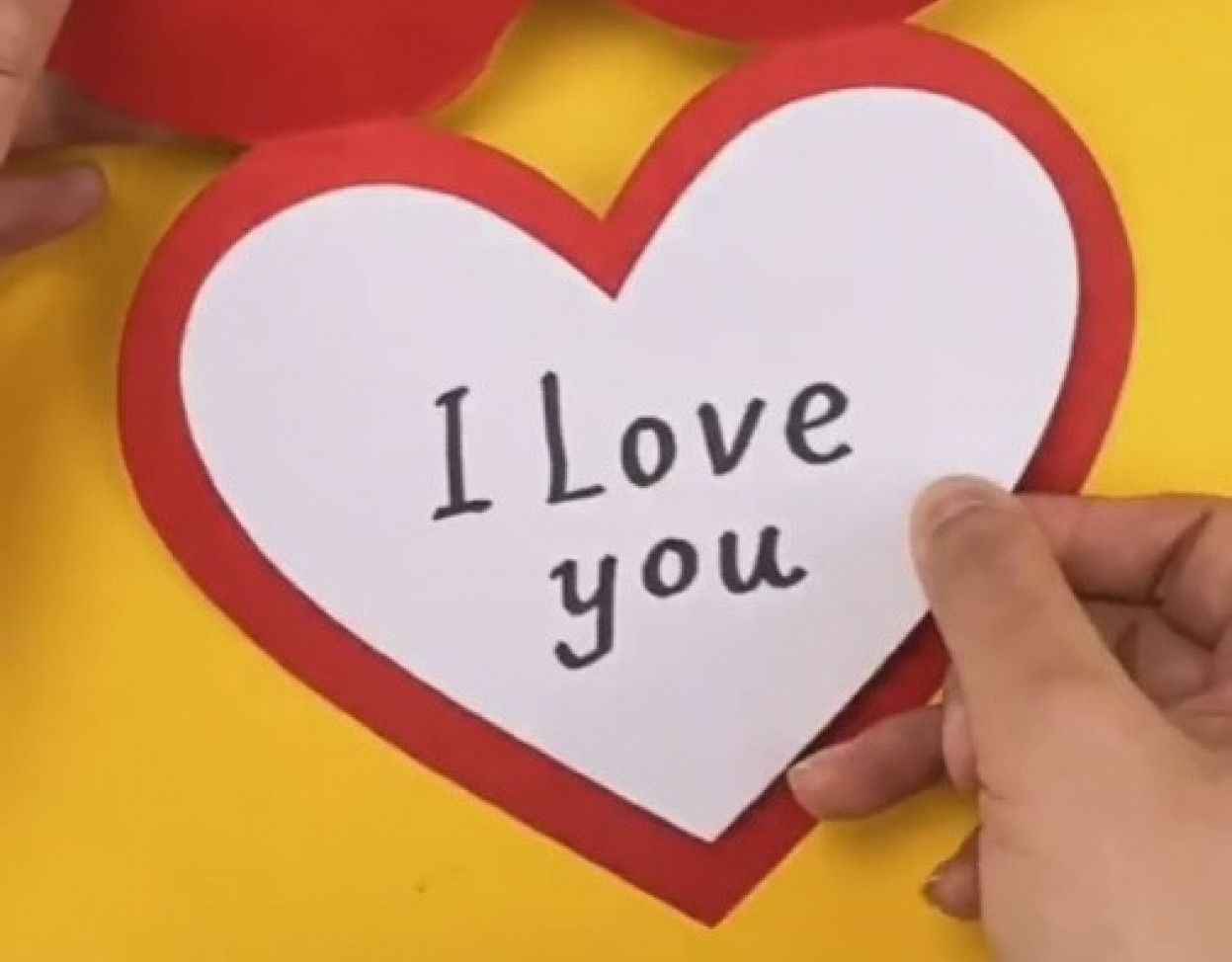 Isecite od belog papira srce, nešto manje nego ono koje čini osnovu čestitke, pa belo srce zalepite u česitiku sa unutrašnje strane. Ispišite tekst vaše čestitke na njemu ali pazite da se mastilo flomastera na preslika na crveni papir.