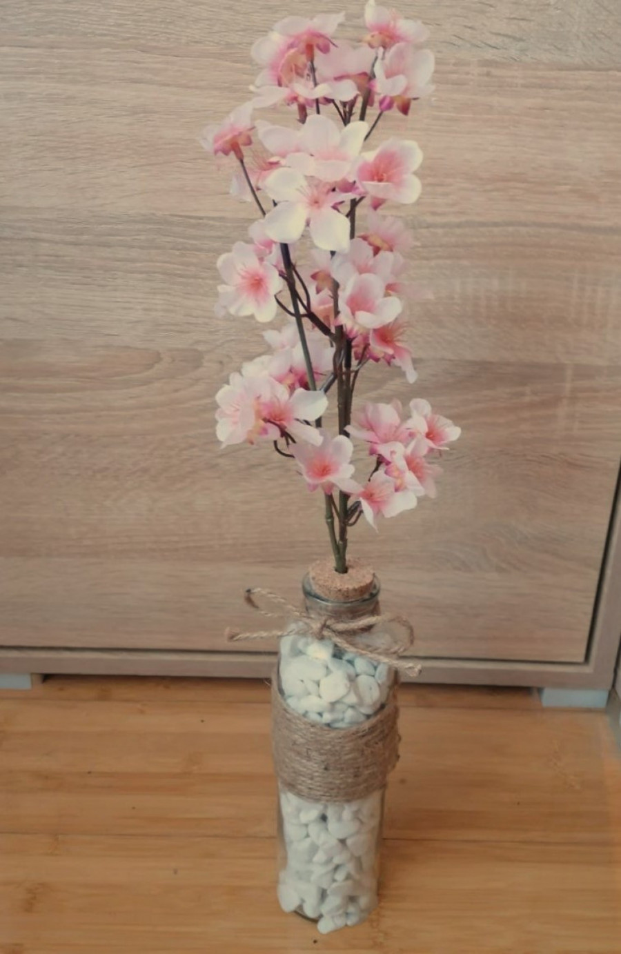 Nakon toga, sipajte ukrasne kamenčiće u željenoj boji u flašu, ali samo do pola. Nakon toga, odvojite jednu grančiću veštačkog cveća sa cele stabljike i isecite je klještima. Provicite granu kroz pampur i u flašu. Kada ste grančicu uspeli da stabilizujete među kamenčićima tako da se ne mrda, dospite kamenčiće do vrha i poklopite flašu pampurom. Jedan komad vunice ili kanapa, dužine najmanje 30 cm isecite makazama. Vežite ga u obliku mašne na grliću flaše ispod otvora. I vaša dekoracija je spremna. Proleće se uselilo i u stan!