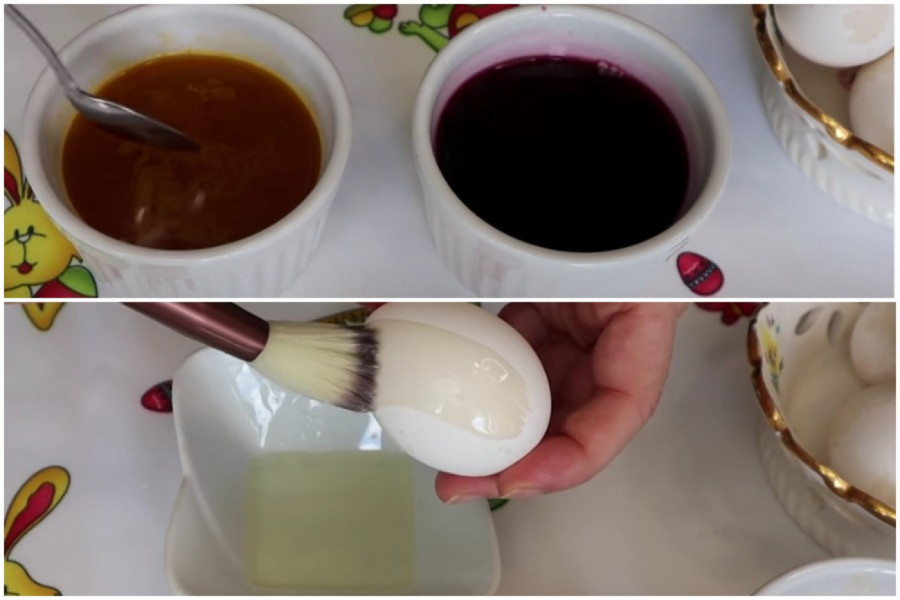 Potrebne su vam tri šolje ili posudice, koje su nešto starije i na kojima vam fleke od farbe neće smetati, klasična praškasta farba za jaja u tamnijim nijansama (po dve kesice u željenim bojama), sirće, kuvana bela jaja, manja i veća čista četkica za šminku i ULJE.
