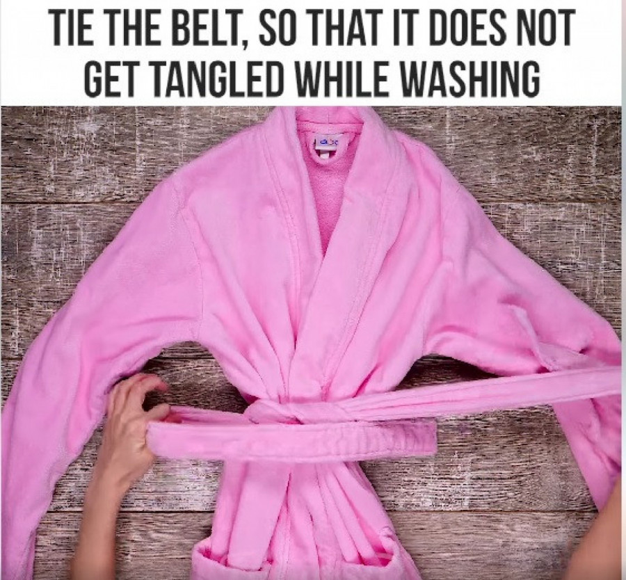 Kada perete bademantile ili bilo šta drugo što ima kaiš, uvek ga svežite i zategnite, kako se kaiš ne bi oštetio ili zapetljao tokom pranja.