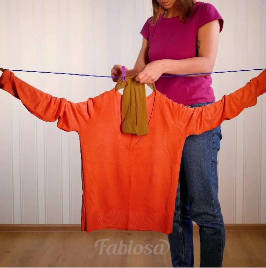 Uzmite par hulahopki, pa svaku nogavicu provucite kroz jedan rukav. Rukave naberite duž nogavica hulahopki, pa umesto kačenja rukava džempera, vrh nogavica hulahopki obmotajte par puta oko žice i štipaljkom pričvrstite za nju. Takođe, štitpaljke koje obično kačite na okovratnik džempera uklonite, pa gaćice hulohopki, koji bi sada trebalo da se nalaze kod otvora za glavu, pričvrstite štipaljkom za žicu. Nakon toga džemper poprskajte vodom i ostavite ga da se tako viseći osuši.