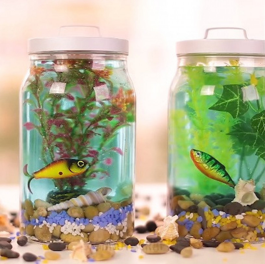 Ovaj poklon je idealan za decu posebno za mališane koji vole ribice a roditelji nemaju gde da drže akvarijum. Uzmite veću teglu i na dno ubacite kamenčiće koje ste doneli sa mora, 3 do 4 školjke i malu veštačku zelenu biljku. Ukoliko je nemate možete je kupiti vrlo jeftino u bilo kom pet šopu. Napunite teglu vodom i kapnite nekoliko kapi plave jestive boje ili mastila da je obojite. Gumene figurice riba zakačite tankim najlonom za poklopac tegle i zatvorite. Ovakav poklon će oduševiti svako dete a mama neće morati da ga čisti kao kad je u pitanju akvarijum sa pravim, živim ribicama.