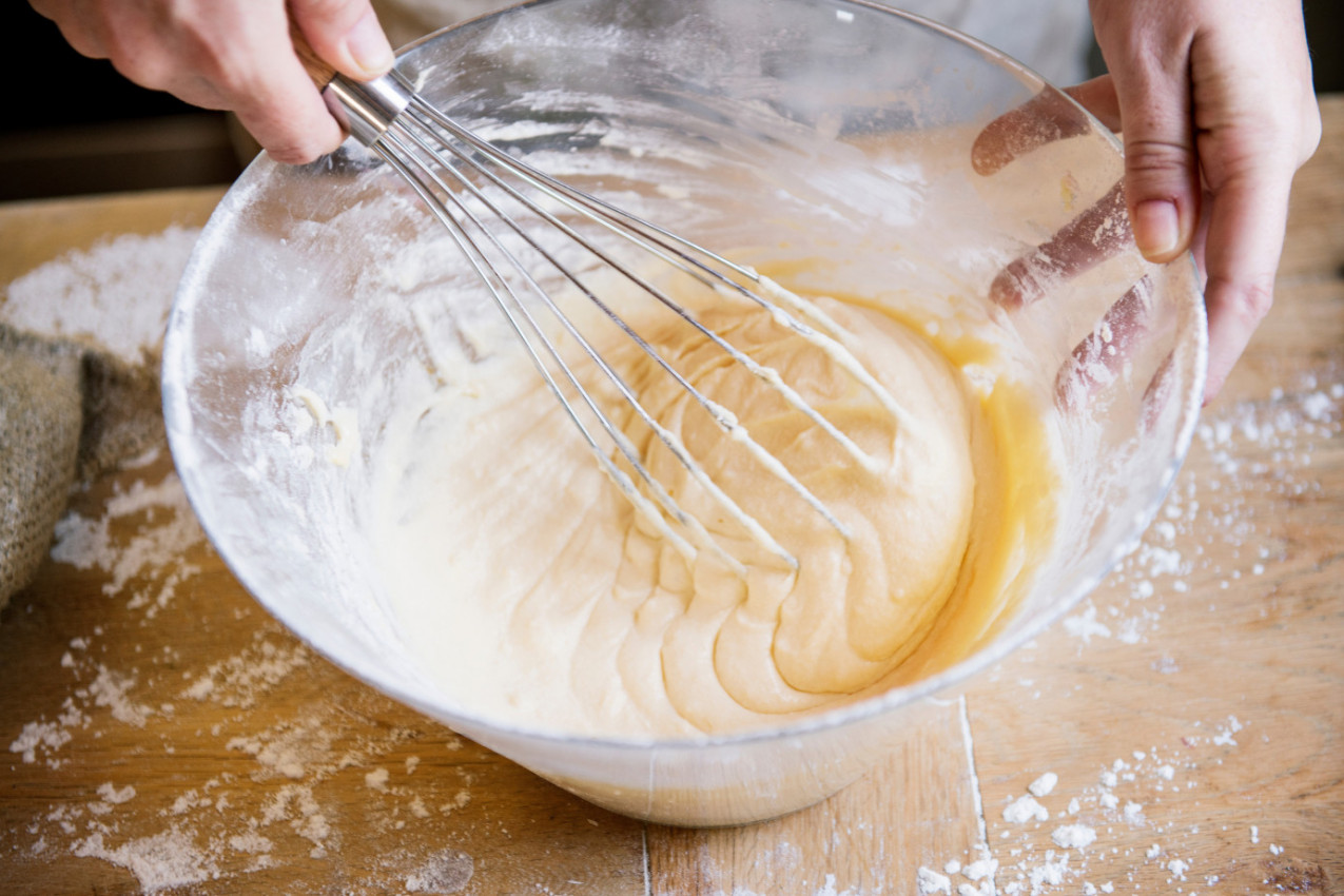 - Mleko i maslac sipajte postepeno, lagano mešajući odozdo prema gore