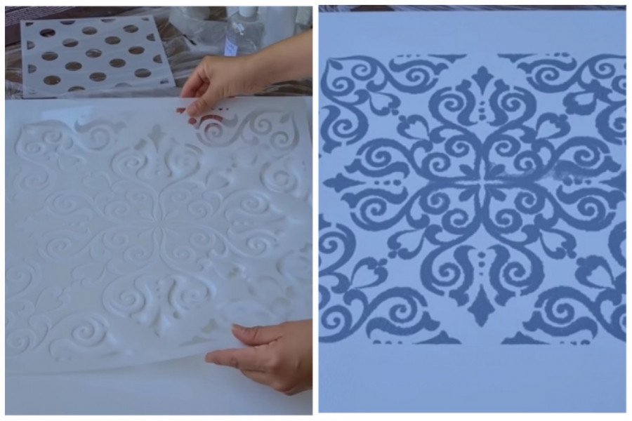 Ukoliko vam jednobojne pločice deluju monotono, možete ih išarati uz pomoć šablona, koje često možete naći u radnjama koje prodaju hobi materijale. Za iscrtavanje će vam biti potrebna boja za keramiku u drugom koloritu. Potražite šablone sa lepljivom stranom, kako biste izbegli prelivanje i curenje boje. Šare iz pomoć šablona nanosite isključivo kada se drugi sloj bazne farbe sasvim osuši, odnosno kada možete da hodate po njemu.