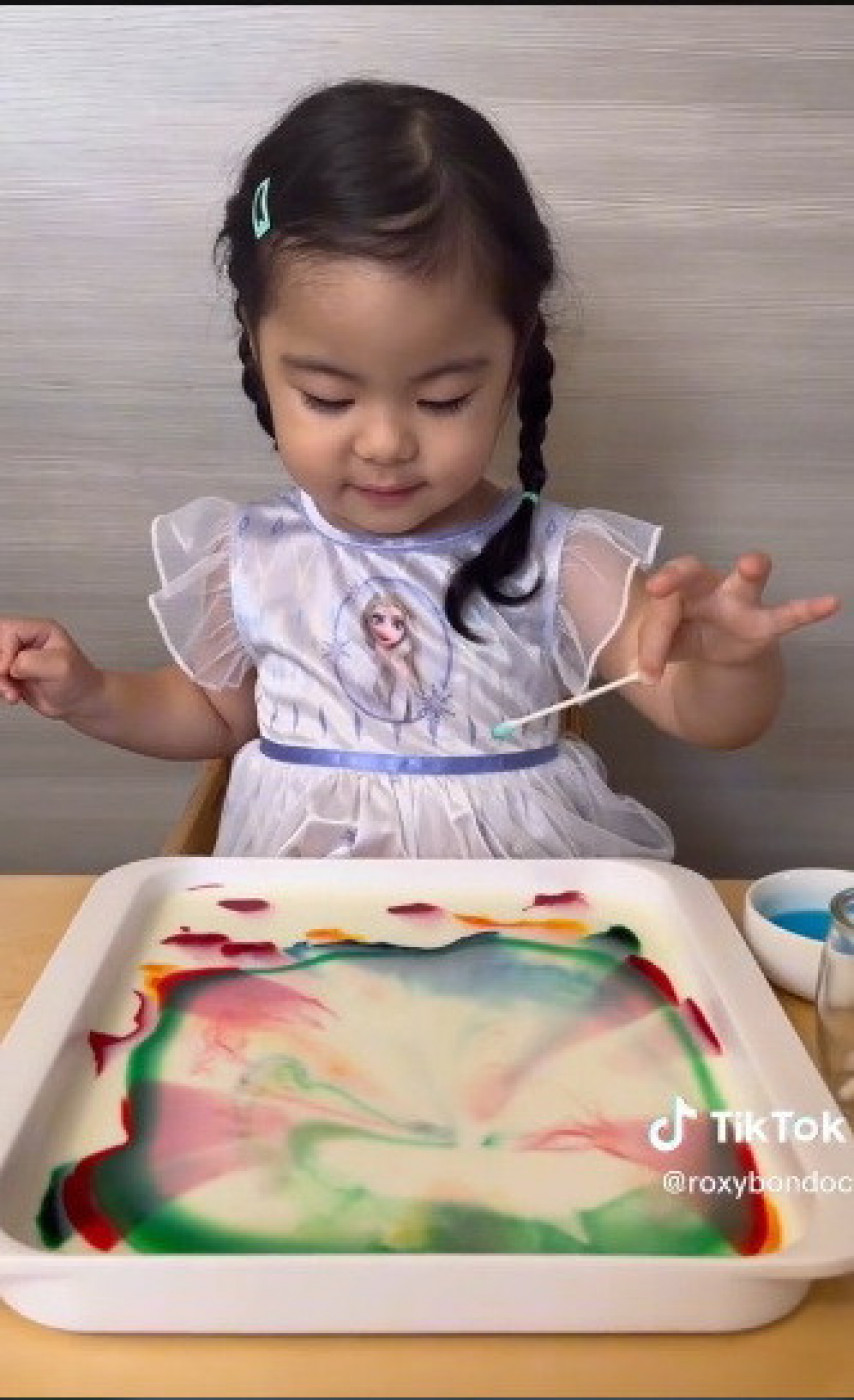 Drugi sjajan eksperiment ili igru možete napraviti pomoću mleka. Kada ste nalili mleko u jednu veliku i malo pliću posudu, možete sipati nekoliko kapi boje u njega, a zatim pamučnim higijenskim štapićem, koje je dete prethodno malo umočilo u deterdžent, dodirujte površinu tečnosti. Ta hemijska reakcija dovodi do neverovatnih vizuelnih efekata prelamanja boja po mleku, što će oduševiti vaše dete.