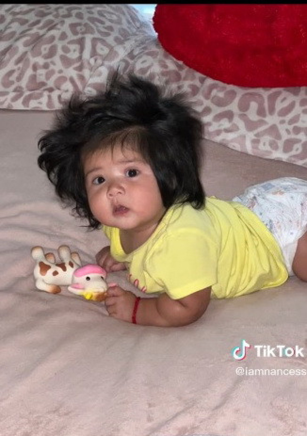 U snimku u kom je ona prikazala fotografije svoje ćerke, a koji počinje slikom ultrazvuka i doktorkinim komentarom, vidi se devojčica zaista nesvakidašnjih vlasi. Fotografije prikazuju njeno odrastanje od svega nekoliko meseci do godinu dana, kada dete ima toliko gustu crnu kosu da izgleda poput lutke ili kao da na sebi ima periku.