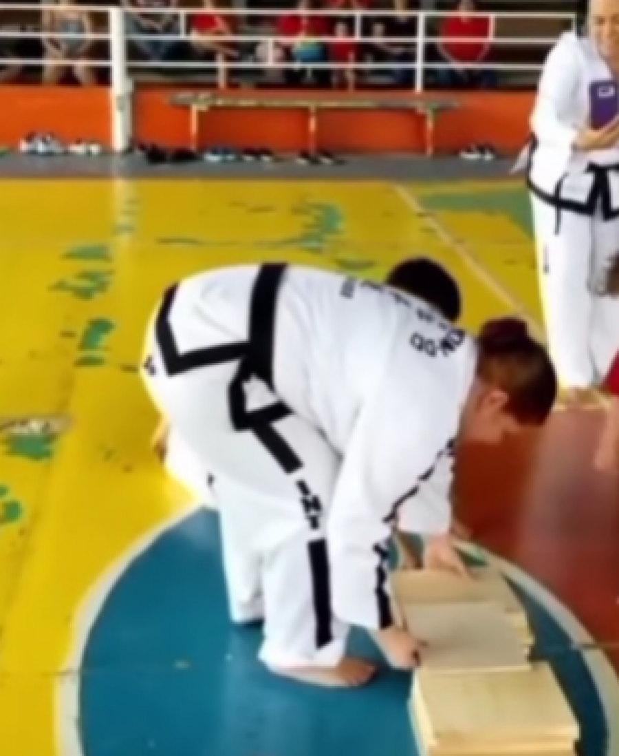 Pločice od iverice su naslagane po podu. Grupice ovih ploča su udaljene taman toliko da se između dve grupe ploča može staviti jedna. Žena koja strpljivo obučava devojčicu uporno pokušava da joj pokaže poentu. Ona uzima pločicu i razbija je rukom. Potom stavlja novu ploču. Problem nastaje u tome što devojčica uporno radi sve ono što joj instruktorka pokazuje, ali totalno pogrešno. Snimak ove devojčice je prikupio blizu 400.000 sviđanja na Instagramu i na stotine komentara.