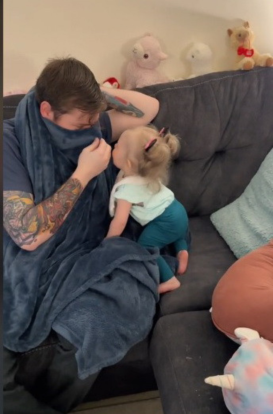 Čoveka supruga, Amanda Rasmusen, objavila je simpatičan video u kom njen muž sakriva lice ispod ćebeta kako bi ćerku napokon iznenadio novim izgledom. Dok ona željno iščekuje da otac skine prekrivač, misleći da je u pitanju igra, muškarac to napokon i čini kako bi otkrio šta se iza toga krije.