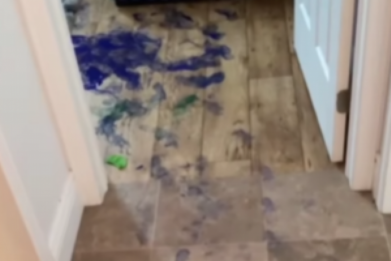 Ova mama primetila je da iz dela dečije sobe ne dopire smeh, svađa, komešanje, niti ikakvi glasovi. Kada su deca preterano tiha, to gotovo po pravilu i bez izuzetaka znači da smišljaju neki nestašluk. Ova mama je oprezno krenula ka dečijoj sobi i odmah ju je sačekao šokantan prizor. Put do dečije sobe bio je umazan raznim bojama, a preovladali su ljubičasti tragovi stopala. Majka je ušla u sobu, a imala je i šta da vidi.