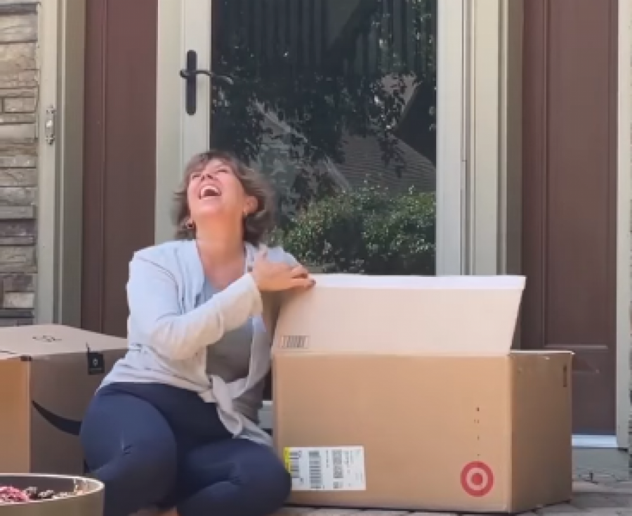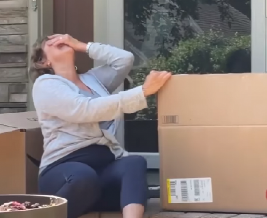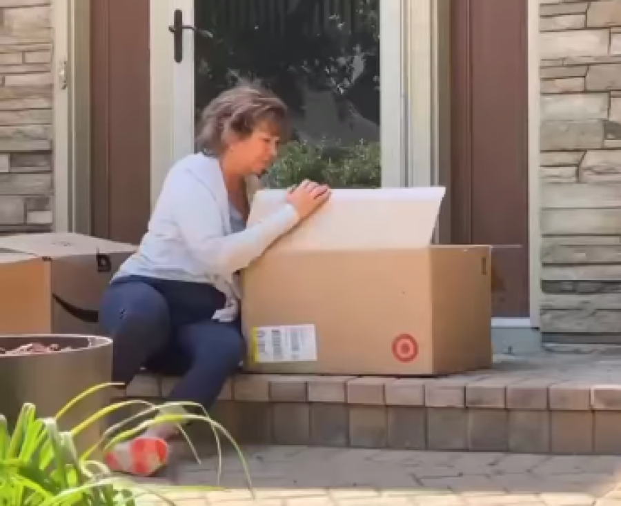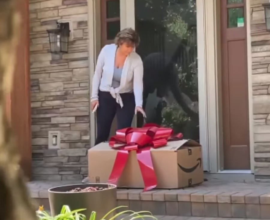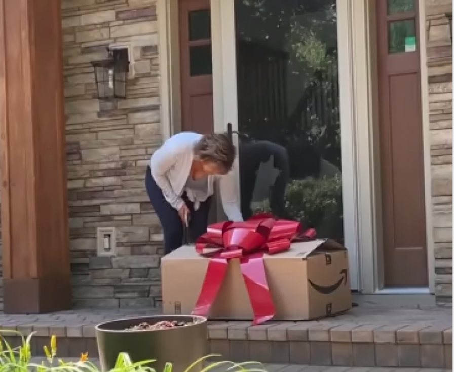 Ćerka nosi ogromnu kartonsku kutiju koja preko ima veliku dekorativnu crvenu ukrasnu mašnu. Ona ostavlja kutiju na pragu svoje mame i zvoni na vrata, a potom žuri kako bi se sakrila iza obližnjeg žbunja, ali ujedno i usnimila sve.