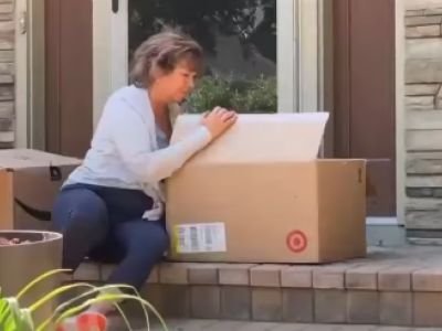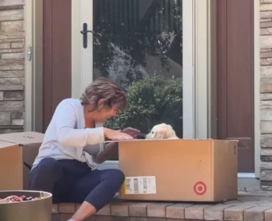 Njena majka prilazi vratima pošto je čula zvona i osmatra koga ima s druge starne. Budući da ne vidi nikog, otvara i druga staklena vrata i zatiče ogroman poklon iznenađenja. Shvativši da je poklon očigledno za nju, ona skida mašnu i otvara kutiju u kojoj zatiče još jednu kartonsku kutiju. Ona otvara i ovu kutiju, a potom prekriva rukama lice od šoka. Žena kreće da se smeje i da udara od sreće nogama o beton baš poput petogodišnjeg deteta. Glava šteneta zlatnog retrivera proviruje iz kutije i ova žena ga nežno uzima u naručje. Pas je još uvek pomalo zbunjen, ali zato je ova žena srećna kao nikada u životu. Njen san se najzad ostvario.