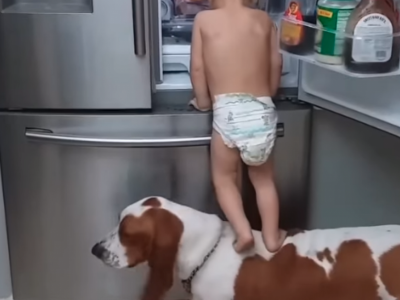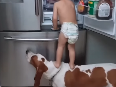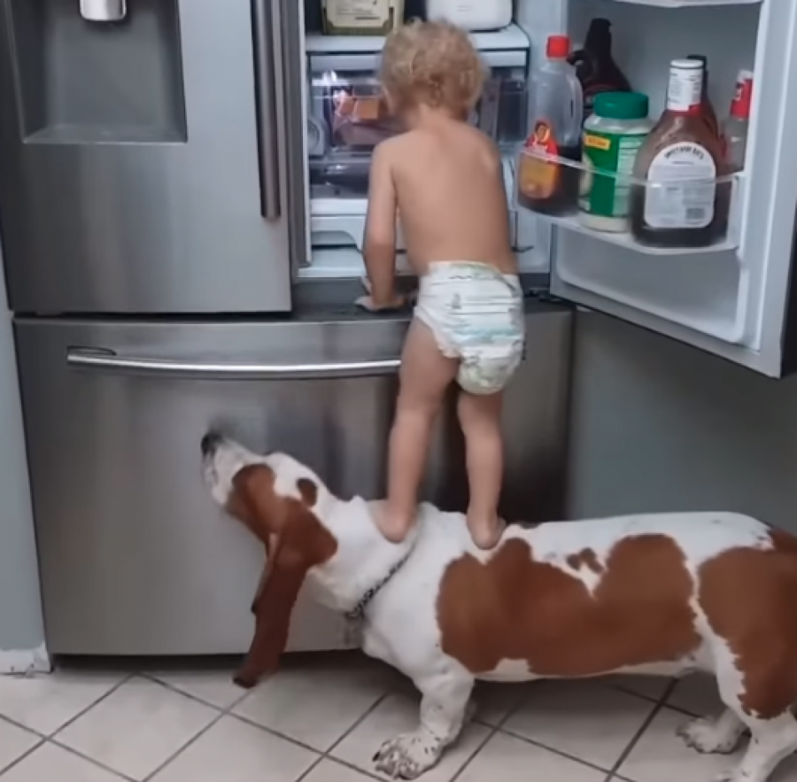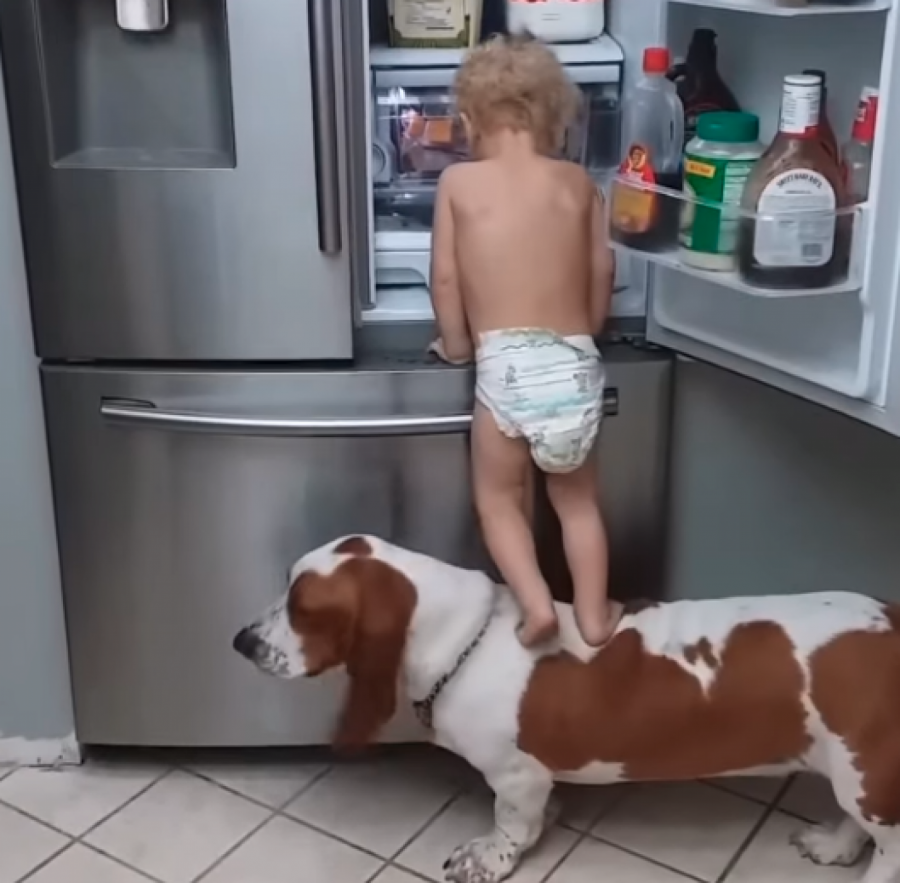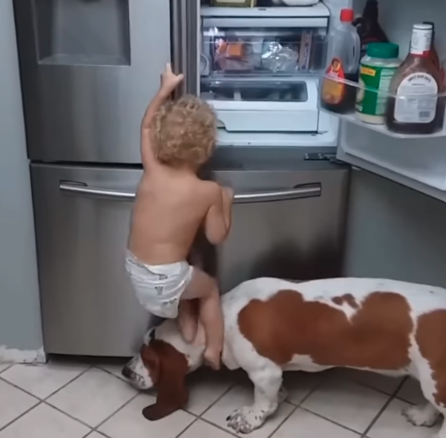 Na snimku se vidi mališan koji je bos i nosi samo pelenu dok se vrzma oko frižedera. Pored njega njegov kućni ljubimac pas jazavičar. Nakon što je razmotri sve opcije, dečak je došao na genijalnu ideju da se popne na psa kako bi dohvatio policu u frižederu.