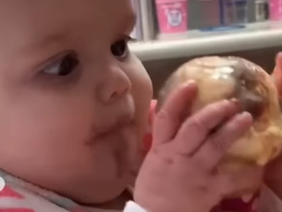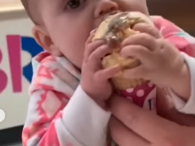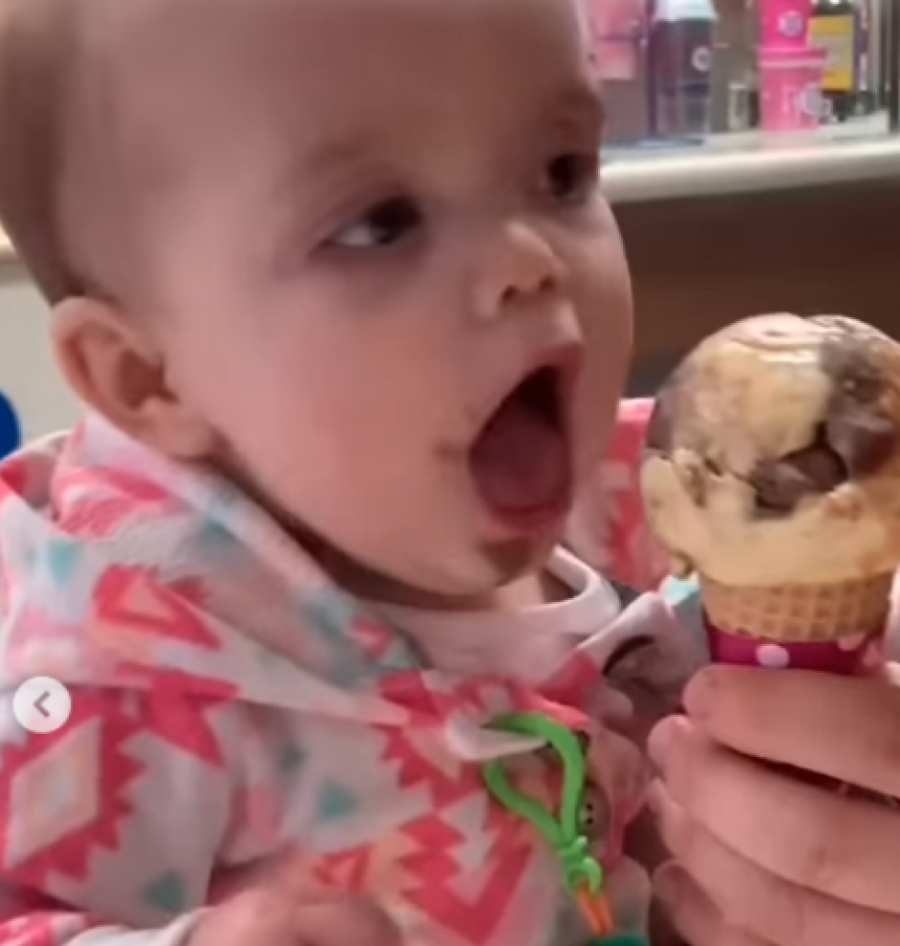 Devojčica je nepoverljivo liznula, ali pošto je shvatila da je u pitanju sladak ukus zastala je vidno zapanjena, a potom rukicama pokušala da dograbi ostatak sladoleda. Ona je toliko je bila oduševljena ukusom, da je tata morao da je pridrži dok je halapljivo nasrnula na sladoled.