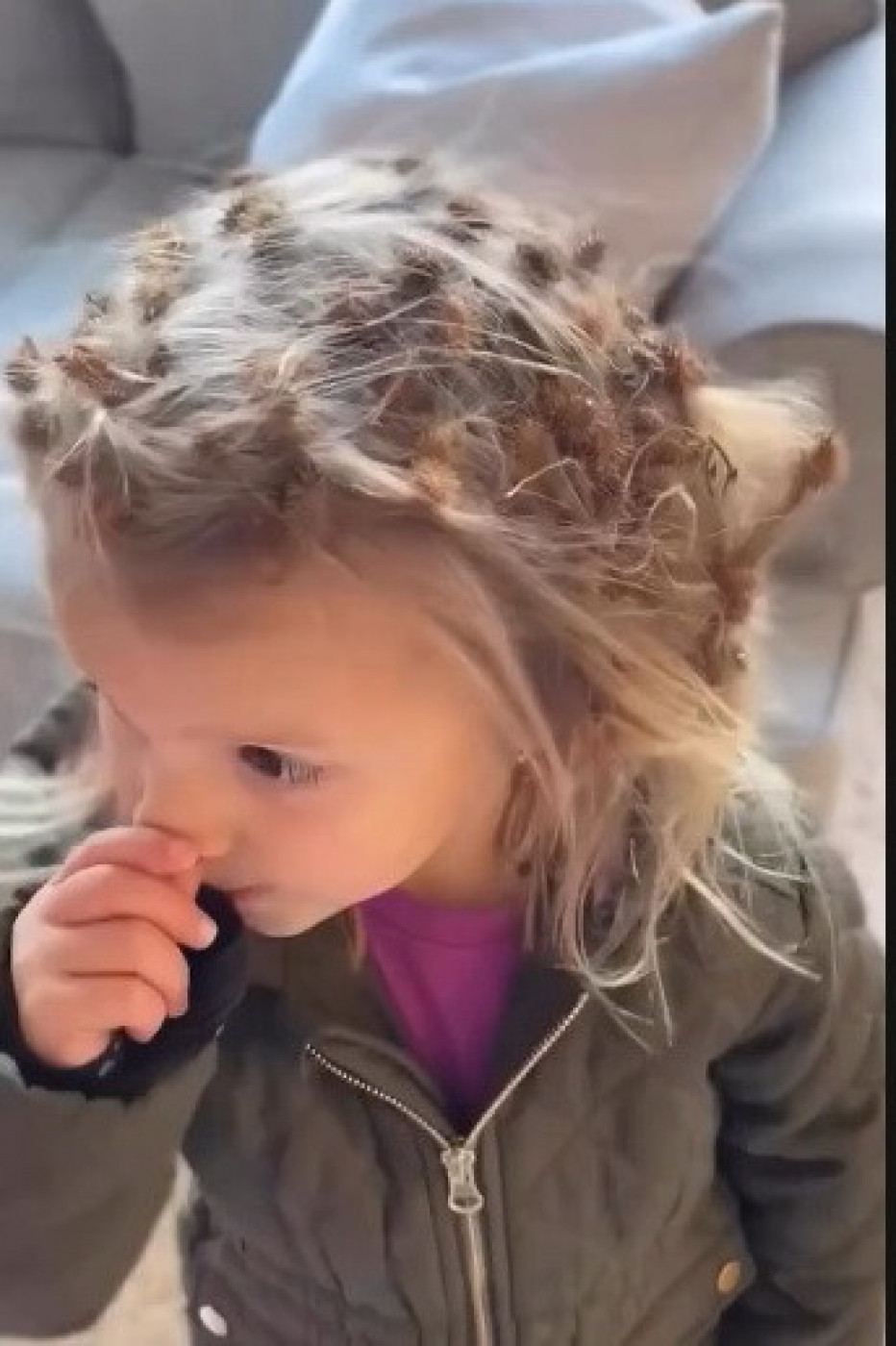 kako je objasnila devojčica je u parku pronašla čičak, dopao joj se pa je rešila da ga iskoristi kao ukras za kosu.