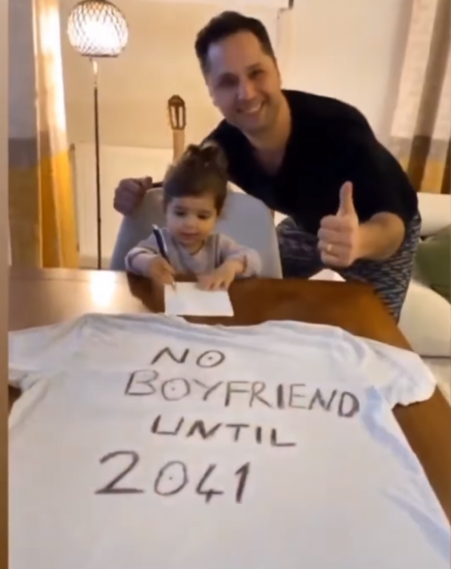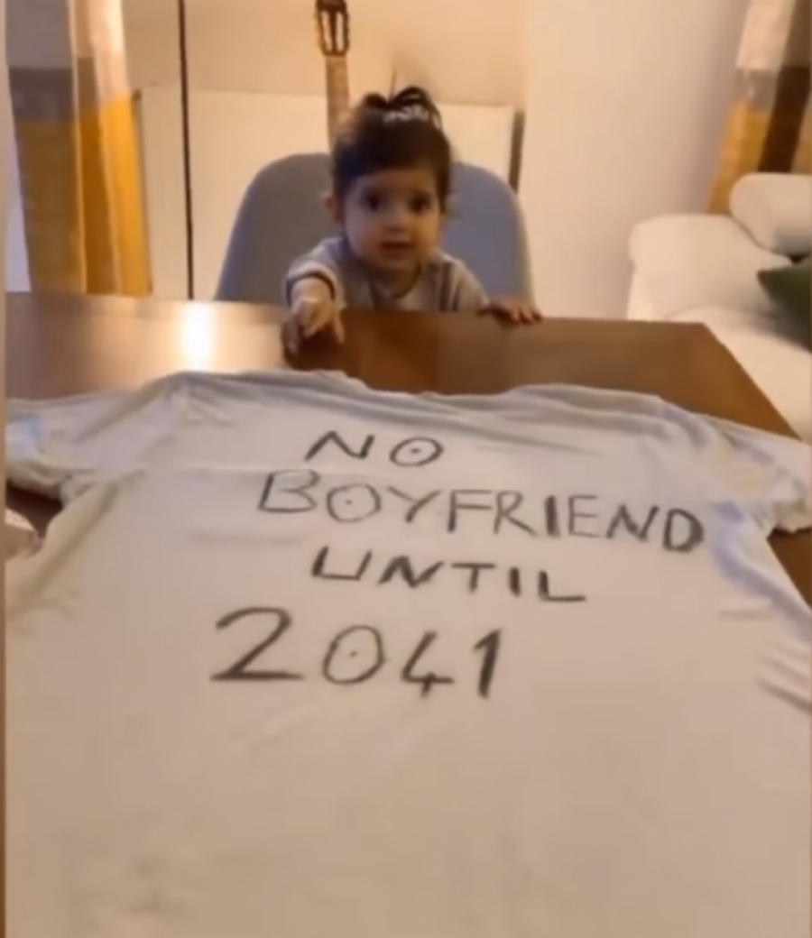 Video počinje slikom devojčice koja ima nešto više od dve godine, koja sedi za stolom, a njen tata stavio je na sto belu majicu na kojoj je velikim slovima ispisano “Nema dečka do 2041. godine”. On ponosno pokazuje tu majicu, koju vraća na sto, pa daje ćerkici list papira kako bi ona, navodno, potpisala kako se slaže da neće imati momka do 2041. godine.