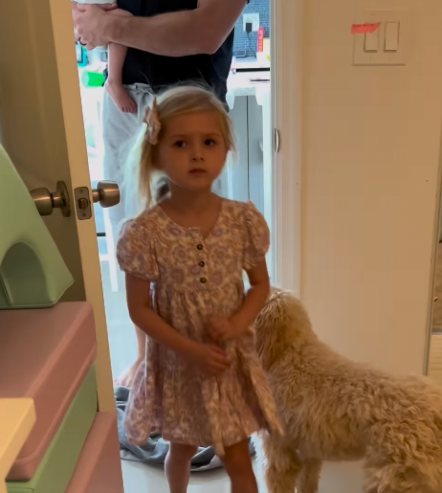 Njen tata zbunjeno stoji na vratima pridržavajući njenu mlađu sestru. Po njegovom izrazu lica reklo bi se da je tata potpuno šokiran kako ponašanjem svoje mezimice, tako i njenom izjavom..