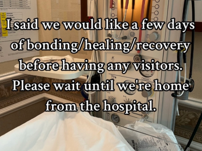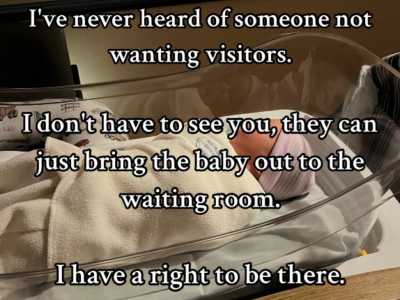 Za početak, Brenda ne bi trebalo da ima nikakvo lično mišljenje koje se tiče posetilaca bilo tokom svog porođaja, bilo kod kuće kada i beba dođe. S druge strane, to uključuje pun hodnik familije njenog supruga koji će biti pozvani od strane njenog svekra i svekrve. Roditelji njenog muža očekuju da im javi čim krene na porođaj i to putem telefonskog poziva, a ne putem poruke, kako bi bili sigurni i primili poziv, da bi obavestili celokupnu rodbinu. Pošto se beba rodi, svekrva očekuje da Brenda svima naglasi da dobro operu ruke pre nego što uzmu bebu u naručje.