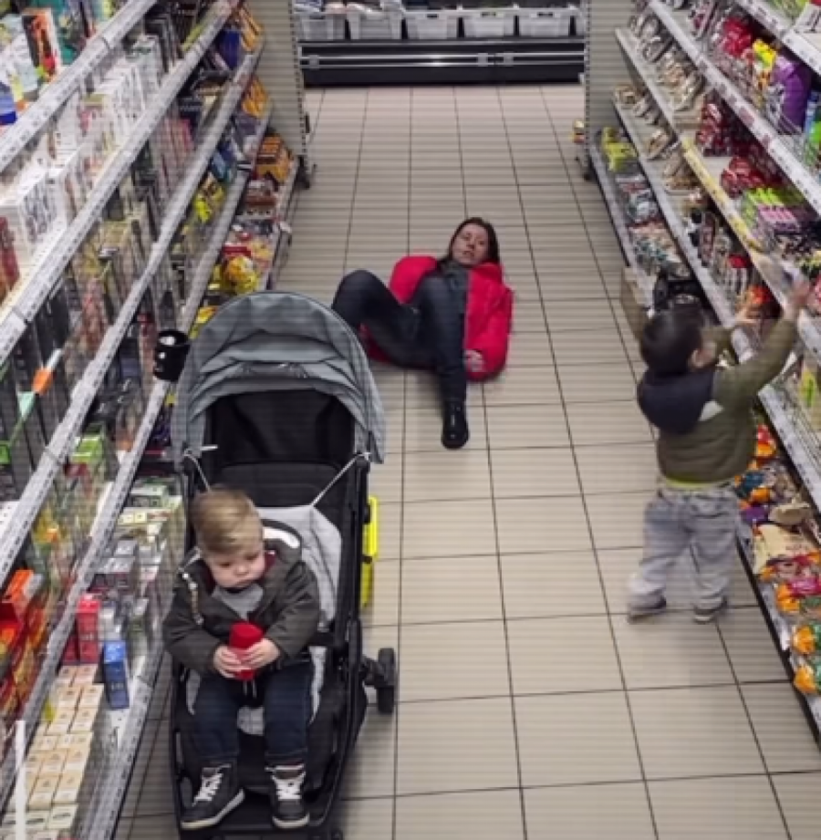 Stariji dečak je uzeo kesicu bombona i pokazao je mami, međutim, na njegovo razočarenje ona je odmahnula glavom, stavivši mu do znanja da ih neće kupiti. Istog trenutka usledila je nezamisliva scena: dete je bacilo kesicu bombona na pod, a potom leglo u svesnoj nameri da histeriše. Iako na snimku nema tona, vidi se kako dete besno udara nogama o pod.
