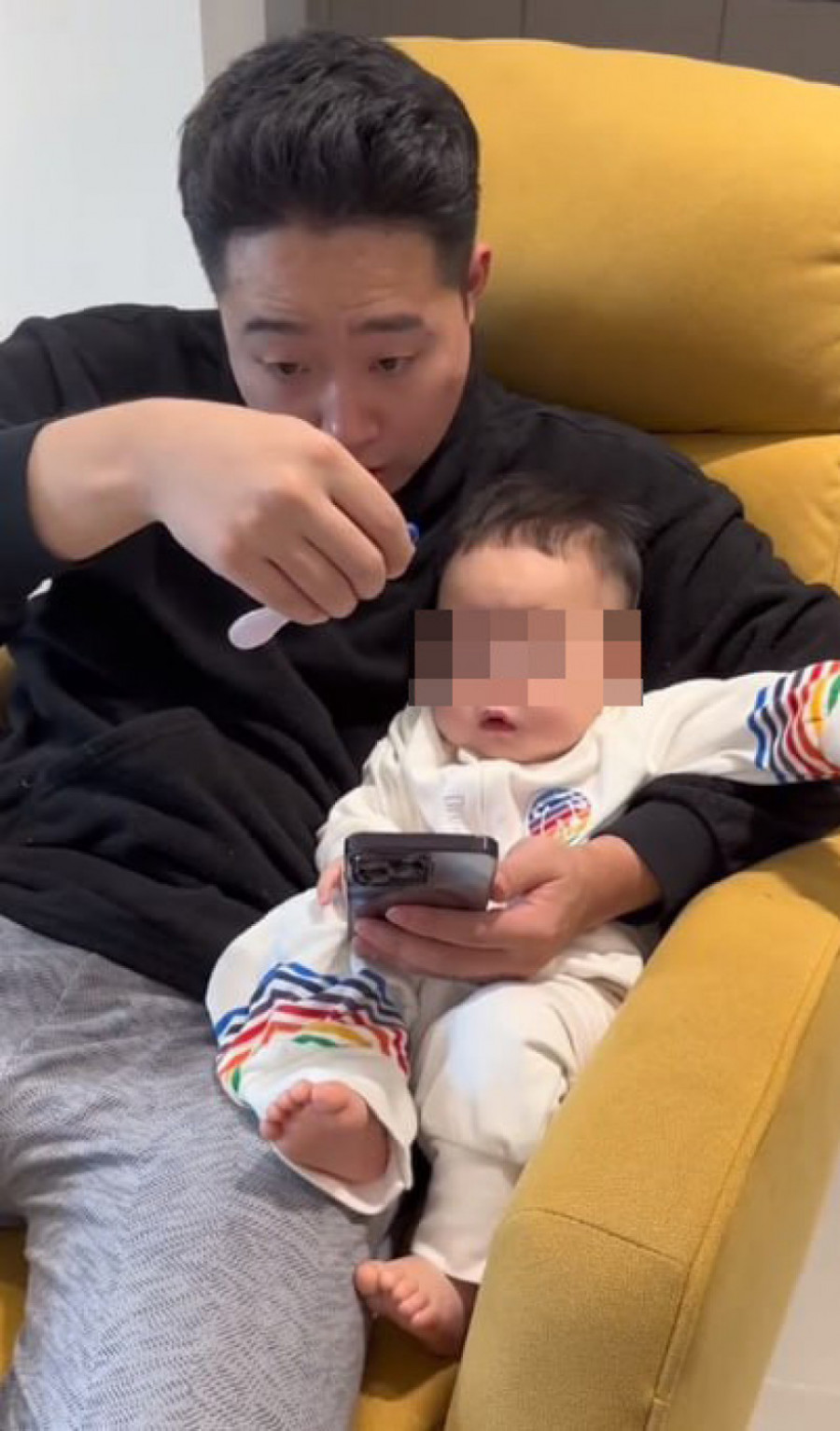 Muškarac sedi na fotelji sa sinčićem u krilima koji nema ni godinu dana. Mališan sedi tati u krilima i čini se da i on gleda u tatin telefon. Žena prilazi i pruža pesnicu ka suprugu. On zbunjeno udara svojom pesnicom o njenu kao u znak pozdrava, ali onda ona otvara šaku i unutra se nalazi kućni test za trudnoću.