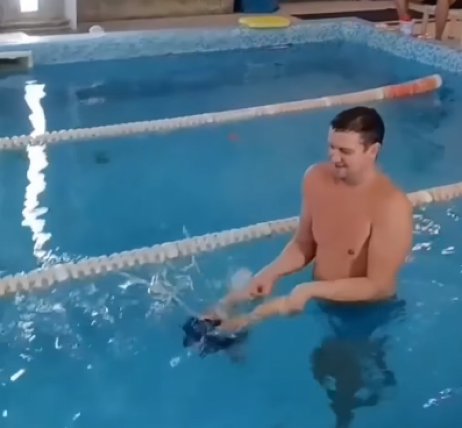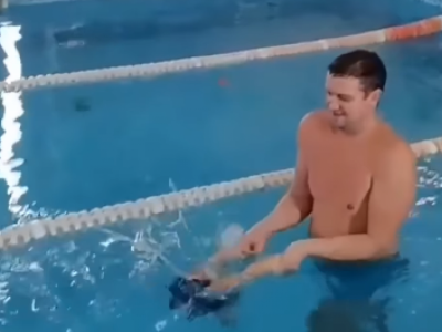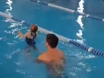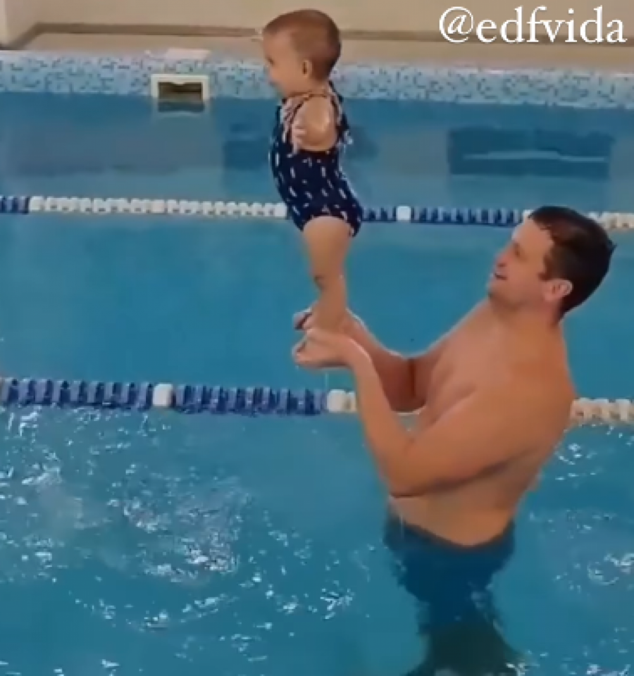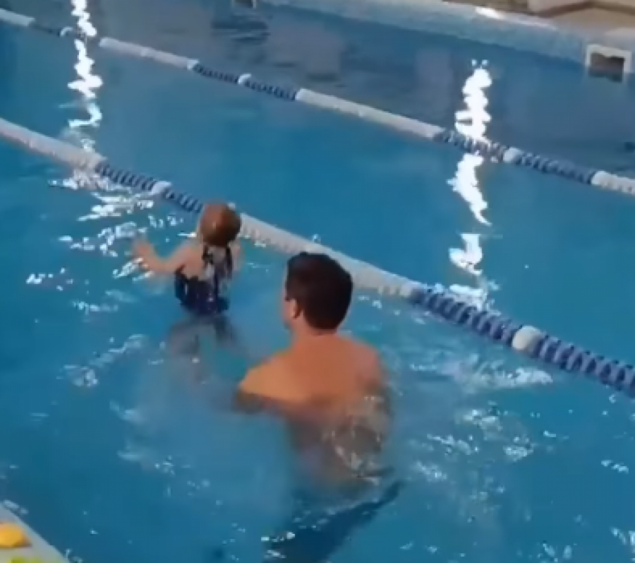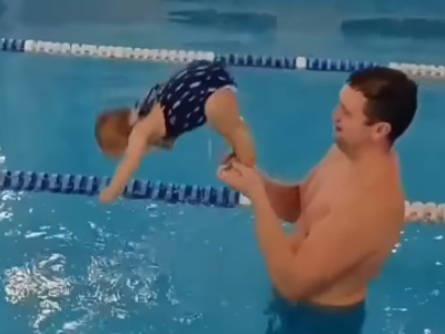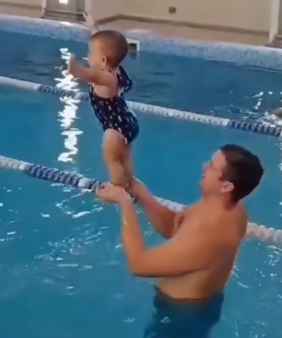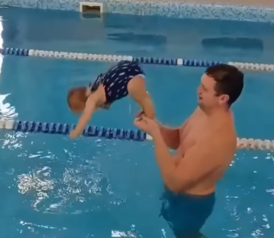 Beba bez kape za bazen, kao i bez naočara za plivanje stoji na rukama svoga tate i odatle skače na glavu u bazen. Tata joj ne ispušta nožice iz ruku ni na trenutak. Devojčica zaranja, a onda izranja i to tapšeći. Ona potom graciozno stoji na rukama svoga tate, održavajući savršenu ravnotežu i pozira, a potom nastavlja sve ponovo.