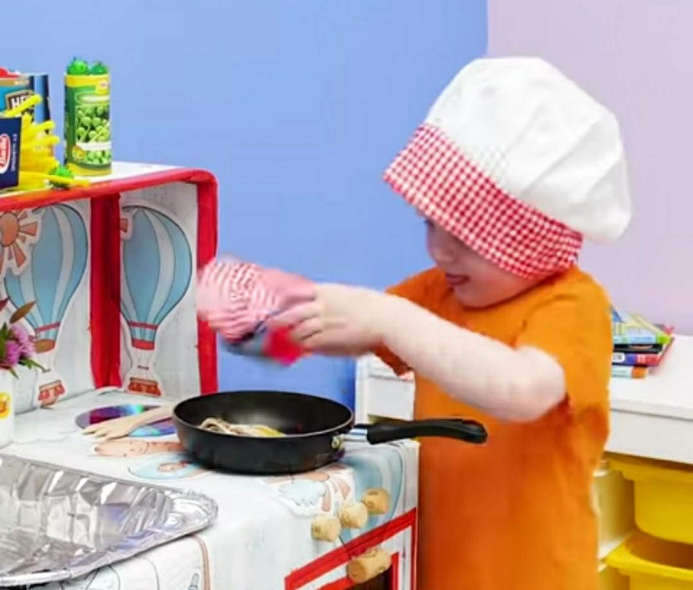 Od veće kutije u kojoj se nalazio neki aparat koji ste kupili napravite šporet tako što ćete iseći vratanca po sredini i ukrasiti ga nekim ukrasnim papirom kojeg možete naći u knjižari. Stavite diskove odnosno Cd-e na površini kutije da budu u funkciji ringle, a pampure od vina možete iskoristiti za dugmad na štednjaku. Iseckajte sunđer i napravite igračku pomfrit za decu. Za špagete koje će deca kuvati na svom improvizovanom šporetu upotrebite vunicu bež boje.