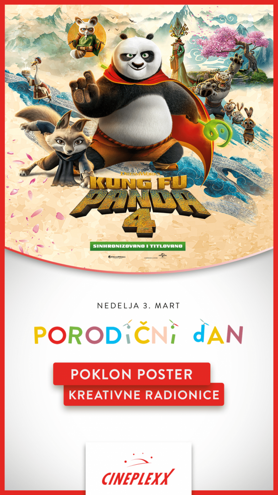 Od događaja u Cineplexx bioskopima vas očekuje svečana premijera porodičnog filma „Kung Fu Panda 4", u subotu, 02. marta u 16:45 časova, u Cineplexx 4D Delta City bioskopu.
