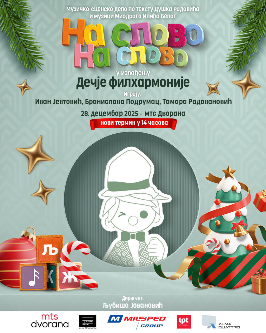 Predstava koja povezuje generacije biće izvedena u dva termina u nedelju 28.12.2025. od 14h i 17h u mts Dvorani. Karte je moguće obezbediti na blagajni i na sajtu mts Dvorane https://www.mtsdvorana.rs/dogadjaj/na-slovo-na-slovo-i-decja-filharmonija.