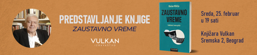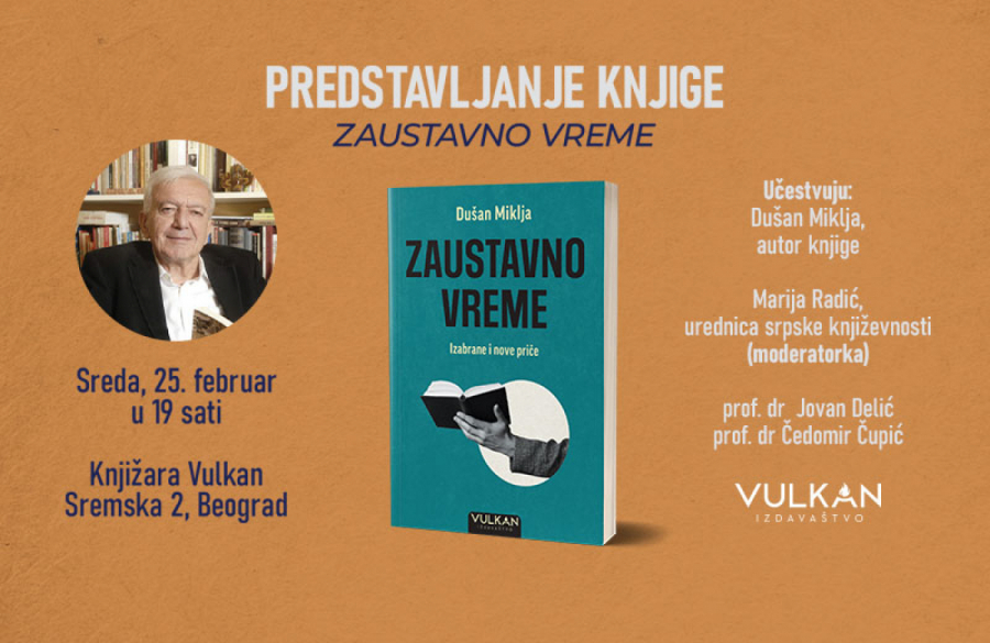 Vulkan knjižare pozivaju vas na predstavljanje najnovijeg izdanja jednog od najznačajnijih srpskih putopisaca, novinara i književnika Dušana Miklje, knjige Zaustavno vreme: Izabrane i nove priče, koje će biti održano u knjižari Vulkan u Sremskoj 2 u Beogradu, u sredu, 25. februara, sa početkom u 19 časova.