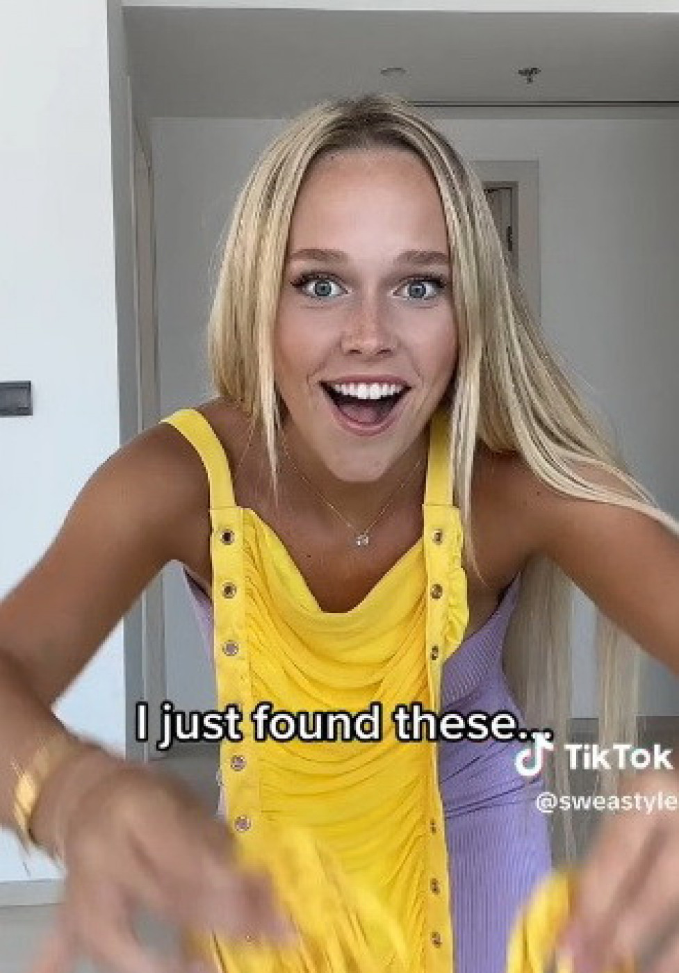 Haljina se navlačila preko glave i bila je sastavljena od dva dugačka kraja: prednjeg i zadnjeg koji bi trebalo da prekrivaju "kritične delove" tela. Međutim, taj komad odeće je bio toliko minijaturan da je devojka posumnjla da li uopšte može da je navuče na sebe. Međutim, platno je bilo rastegljivo i u sebi je sadržalo lasteks, zbog čega se lako prilagođavala telu. Ipak, Tiktokerka je rešila da novu haljinu navuče preko jedne koju je već imala na sebi, ne bi li svojim pratiocima priredila pravu golišavu predstavu.