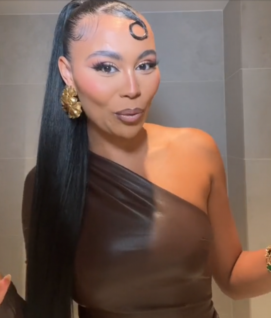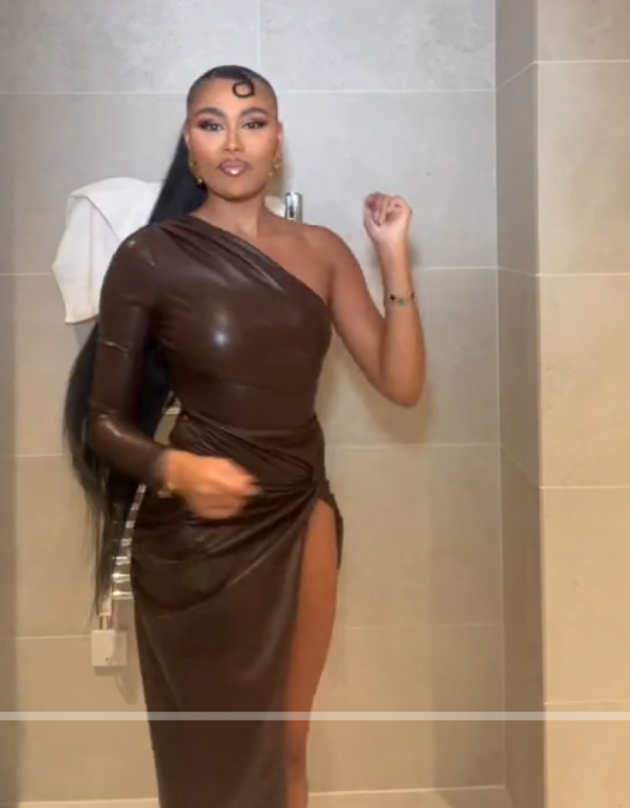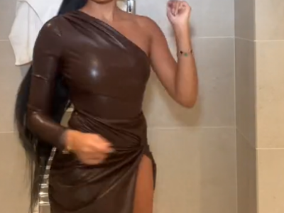Odluka je na kraju pala na braon haljinu od lateksa koja je bila neobičnog dizajna, a koštala je 250 evra. Haljina je bila totalno pripijena uz njeno telo, imala je jedan rukav, dok je otrivala drugo golo rame. Kreacija je bila nabrana u predelu struka, odakle se spuštala do zemlje prateći liniju tela. Takođe je u predelu levog kuka imala veoma dubok šlic, koji je dosezao maltene do međunožja ove lepotice.