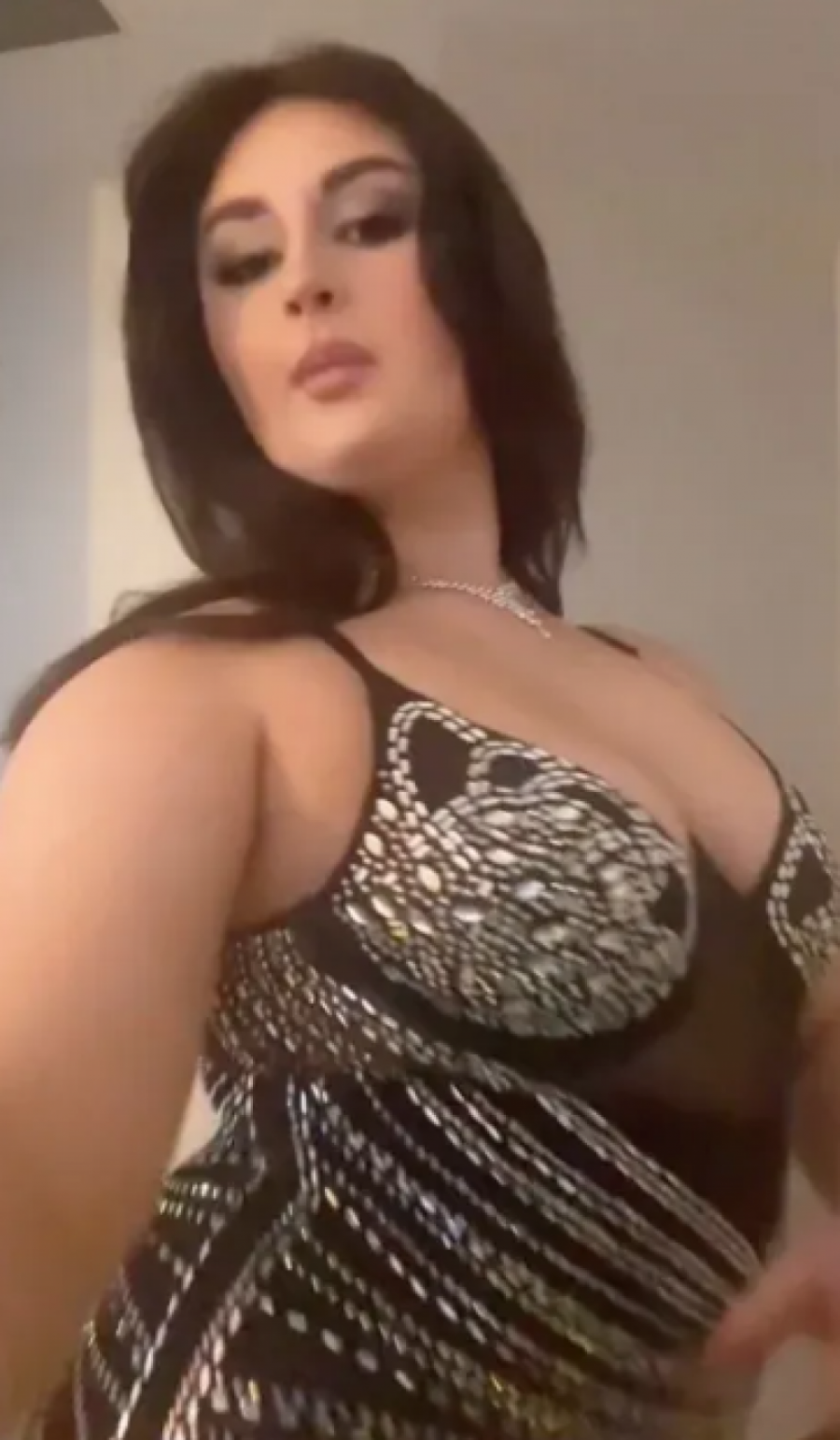 Ona je smatrala da će providna haljina dubokog dekoltea najbolje dočarati njen modni stil i ličnost, a očigledno je da se u njoj osećala punom samopouzdanja i veoma udobno. Haljina za koju se opredelila bila je duga do poda i izrađena od crnog kompletno providnog materijala. Preko njega su bili prišiveni cirkoni, dok je primetno da je devojka ispod imala dubok crni steznik. Haljina je u gornjem delu bila u vidu korseta dubokog dekoltea, što izgleda da nimalo nije predstavljalo problem ovoj devojci.