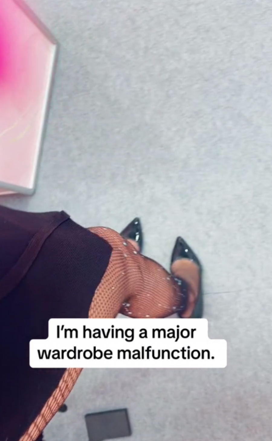 Keri je Tiktokerka koja je odlučila da se dotera za sajam kozmetike i nakita. To je bio poseban događaj za nju i njen posao i izabrala je elegantnu crnu haljinu midi dužine, ispod koje je ponela crne mrežaste čarape. Međutim baš kada to nikako nije trebalo da se dogodi, usledio je pravi modni peh.