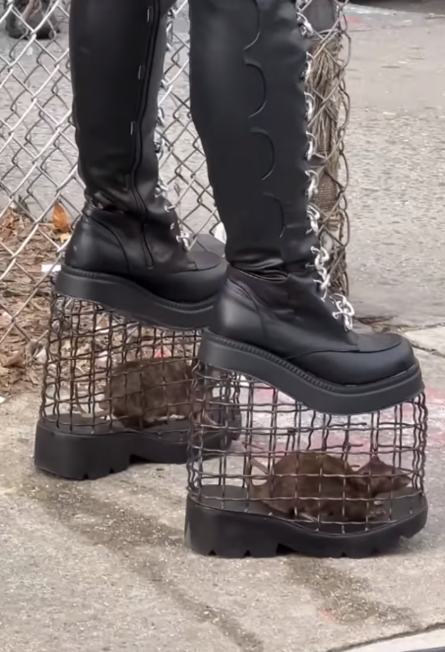 Na ulicama Njujorka, jedna devojka je privukla pažnju svojim neobičnim modnim izborom. Stajala je u kratkoj crnoj lakiranoj kožnoj jakni, kratkoj crnoj teksas suknji i dugim crnim čizmama sa ogromnim platformama. Međutim, ono što je iznenadilo prolaznike bilo je otkriće da su te čizme zapravo imale kavez ispod đona, a unutar kaveza su bili preparirani pacovi.