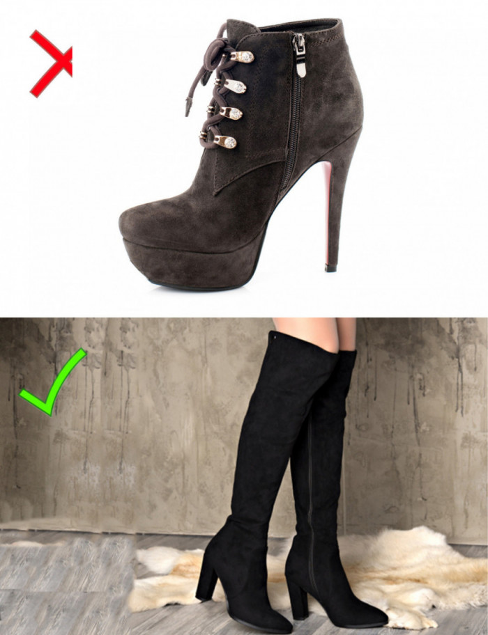 Gležnjače mogu biti vrlo nezgodne jer uvek privlače pažnju na listove, što zauzvrat može učiniti da vaši gležnjevi izgledaju deblji nego što jesu. Zato radije birajte duge čizme koje laskaju vašim nogama bez obzira da li imate debele listove ili ne. Samo morate pronaći model koji je dovoljno udoban.