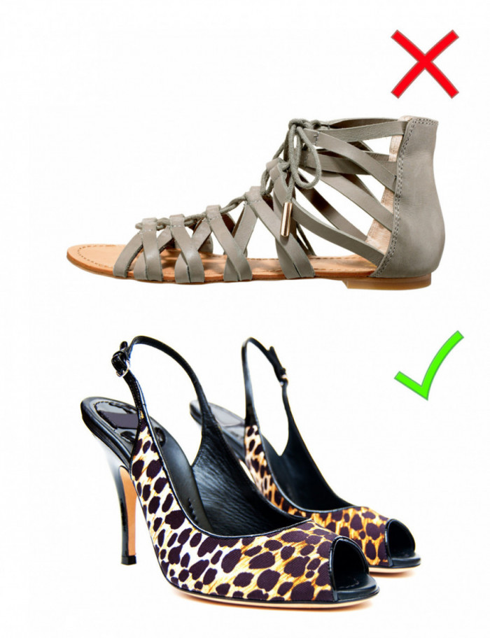 Ovakva vrsta obuiće se ne preporučuje ženama koje žele da im noge izgledaju vitkije. Kaševi na cipelama ili sandalama dodatno skreću pažnju na oge i vizuleno ih skraćuju. Umesto njih odaberite klasične sandale sa otvorenim prstima i visokom potpeticom. Što je štikla tanja to su cipele neudobnije pa pronađite zlatnu sredinu za sebe.