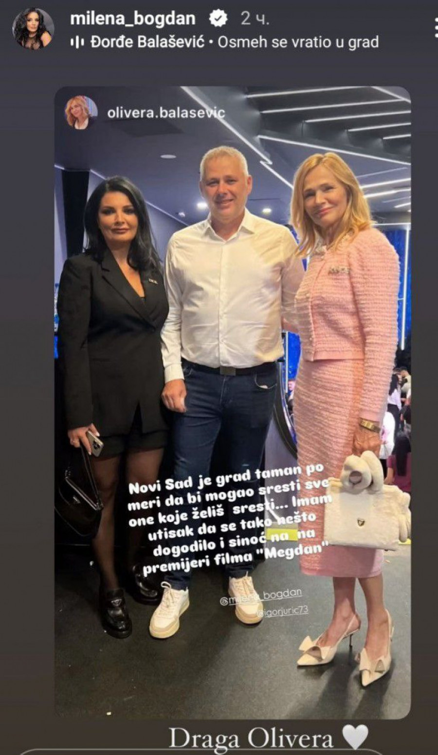 - Novi Sad je grad taman po meri da bi mogao sresti sve one koje želiš sresti. Imam utisak da se tako nešto dogodilo sinoć na premijeri filma "Megdan" - napisala je Olivera u opisu fotografije sa Milenom i Igrom koju je objavila u vidu Instagram priče.