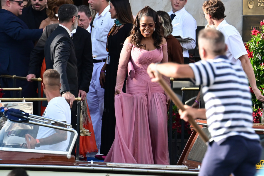 Opra Vinfri (71) ostavila je sve bez daha u nežnoružičastoj čipkanoj haljini sa spuštenim ramenima, pokazujući vitku figuru pri izlasku iz hotela Gritti Palace.