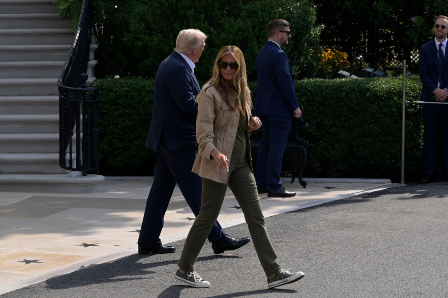 Izlazeći iz Bele kuće, Melanija se pojavila u opuštenoj, ali pažljivo osmišljenoj kombinaciji - jednostavne pantalone i majica u jednobojnom tonu upotpunjeni su jaknom sportskog kroja i patikama koje su izazvale nostalgične reakcije.