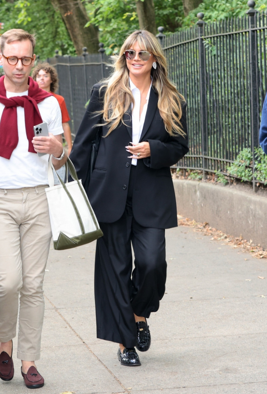 Hajdi ih je iskombinovala uz široke crne pantalone koje dodatno izdužuju figuru, belu raskopčanu košulju koja daje ležeran ton i crni oversajzd sako koji unosi dozu ozbiljnosti i elegancije. Celu kombinaciju upotpunila je tamnim naočarima za sunce i diskretnim, ali efektnim srebrnim minđušama i prstenom. Rezultat je moderan, opušten, ali i izuzetno sofisticiran izgled.