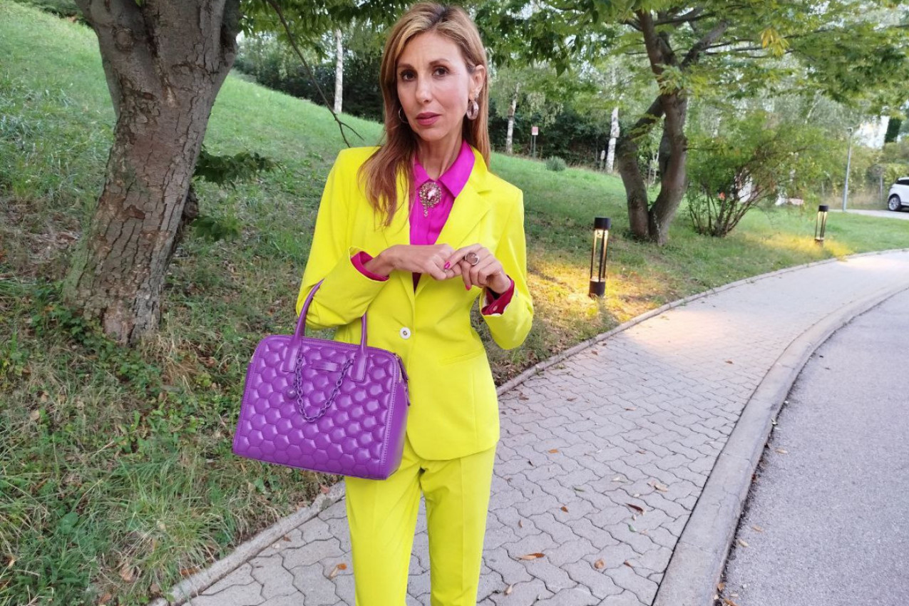 Naime, pojavila se u neonski žutom kompletu koji se sastojao iz pantalona i strukiranog sakoa, dužeg modela, koji je zakopčala. Monotoniju jarko žute boje razbila je kontrastnom bojom i to kombinacijom pink i ljubičaste. Na nekome drugome bi možda ova kombinacija boja delovala čudno, ali ne i na Drini, koja ju je iznela na pravi način. Tako je košulja bila u ciklama nijansi, koja je vukla na pink boju, dok su salonke visokih potpetica, kao i tašna bile ljubičaste. Nije izostao ni broš, takođe u pink boji, kao ni upečatljiv nakit.