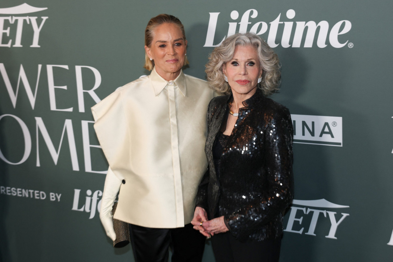 Glumica se pojavila u impresivnom crnom odelu s pantalonama i sakoom, koji su dodatno zablistali zahvaljujući diskretnim šljokicama, unoseći dozu glamura u elegantan stajling. Njena pojava bila je moćna i samouverena dok je pozirala uz koleginicu Šeron Stoun, koja je zračila sofisticiranošću u beloj, elegantnoj bluzi i klasičnim crnim pantalonama.
