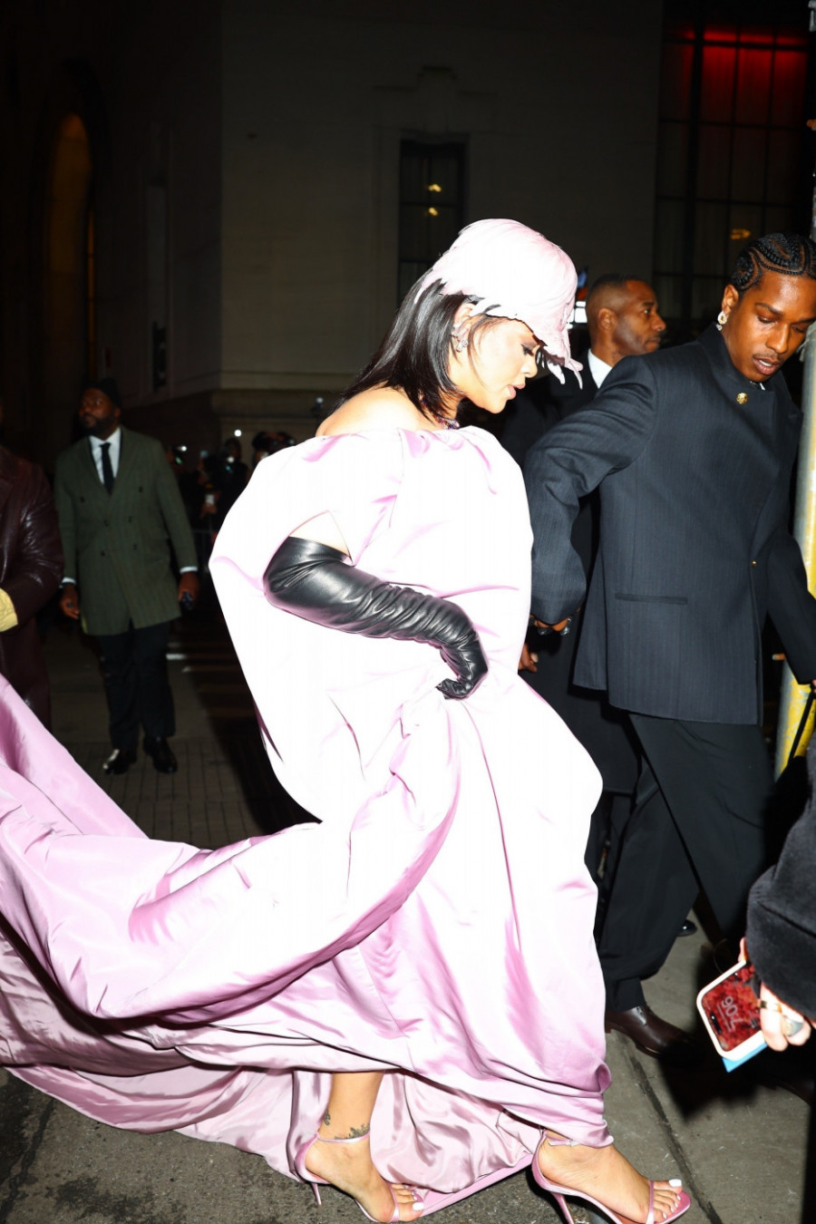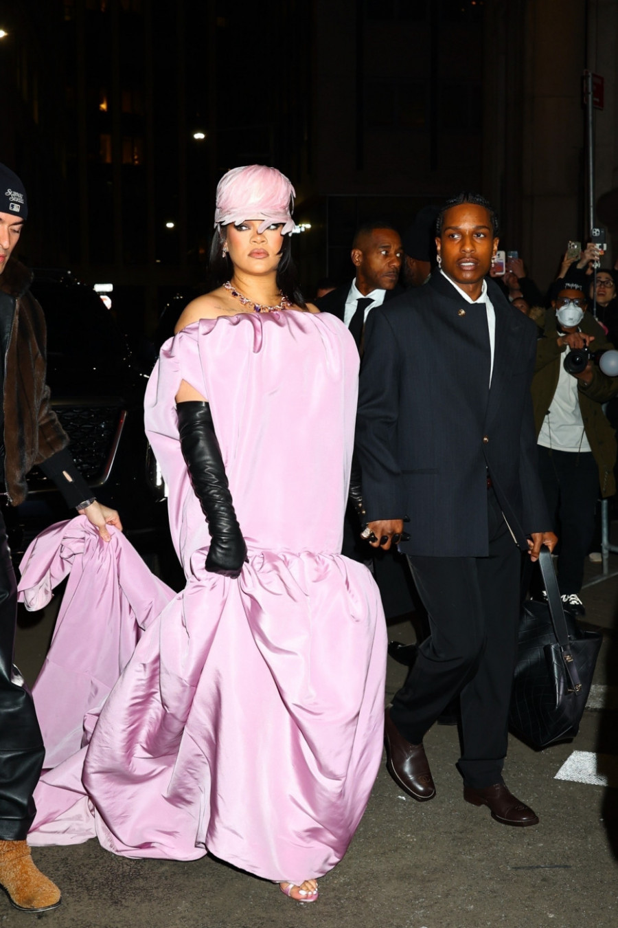 Za ovaj događaj, Rijana je nosila roze, slojevitu haljinu sa odgovarajućim pernatim šeširom, uparenu sa crnim kožnim opernim rukavicama, dok je Roki nosio crno-teget prugasto odelo.