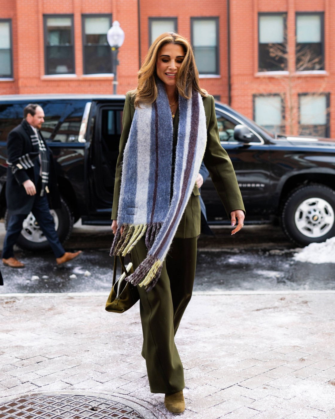 Za diplomatski susret sa Ušom Vens, kraljica je izabrala strogo krojeno maslinasto odelo modne kuće “Maison Alaïa”. Fluidni kroj pantalona i strukturirani sako formirali su snažnu siluetu, dok je upečatljiv vuneni šal brenda “Loewe” dao kombinaciji poseban pečat.