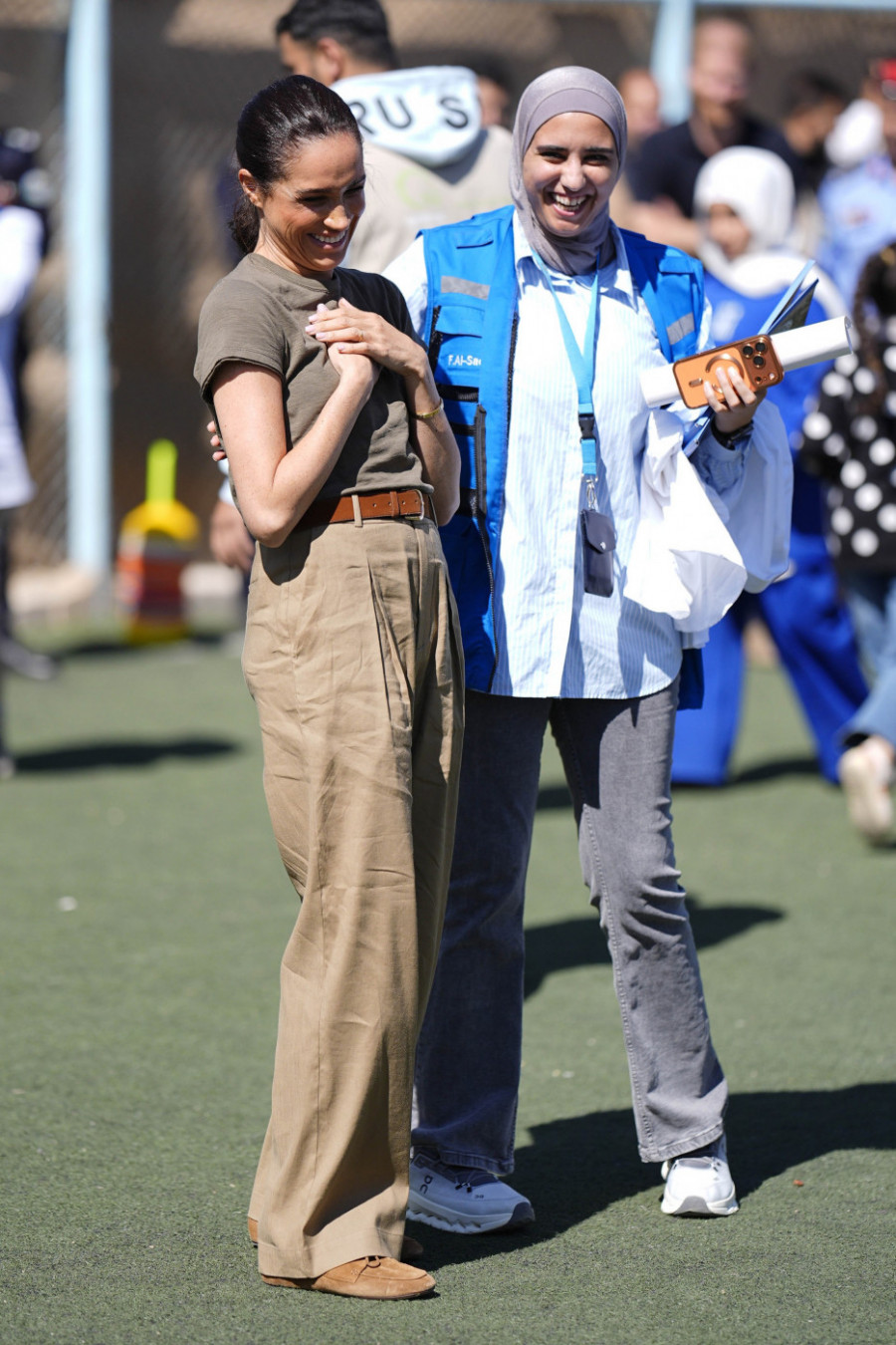 Pre dolaska u kamp, par je u Amanu učestvovao na okruglom stolu sa predstavnicima Ujedinjenih nacija, diplomatskog hora i međunarodnih donatora. Tamo je Megan nosila elegantno, potpuno belo odelo, naglašavajući formalni karakter susreta. Međutim, za drugi deo dana odlučila se za znatno opušteniju kombinaciju. Odabrala je pantalone širokih nogavica i visokog struka, koje je istakla kaišem, uz jednostavnu majicu kratkih rukava. Preko toga je obukla belu košulju koja joj je poslužila kao lagana jakna tokom boravka u učionici.