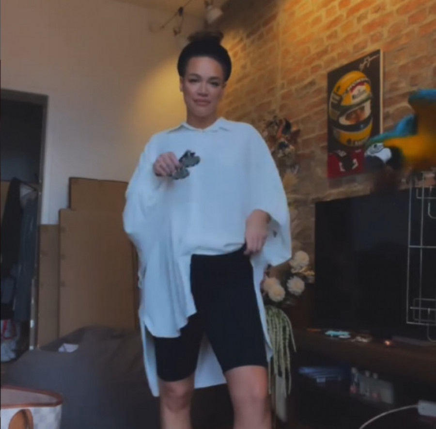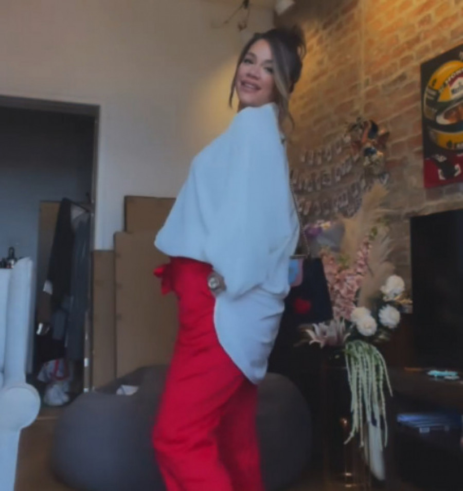 Marija je sa svojim pratiocima na Instagramu podelila video na kome isprobava i 35-oj nedelji trudnoće belu oversajz košulju uz različite pantalone.